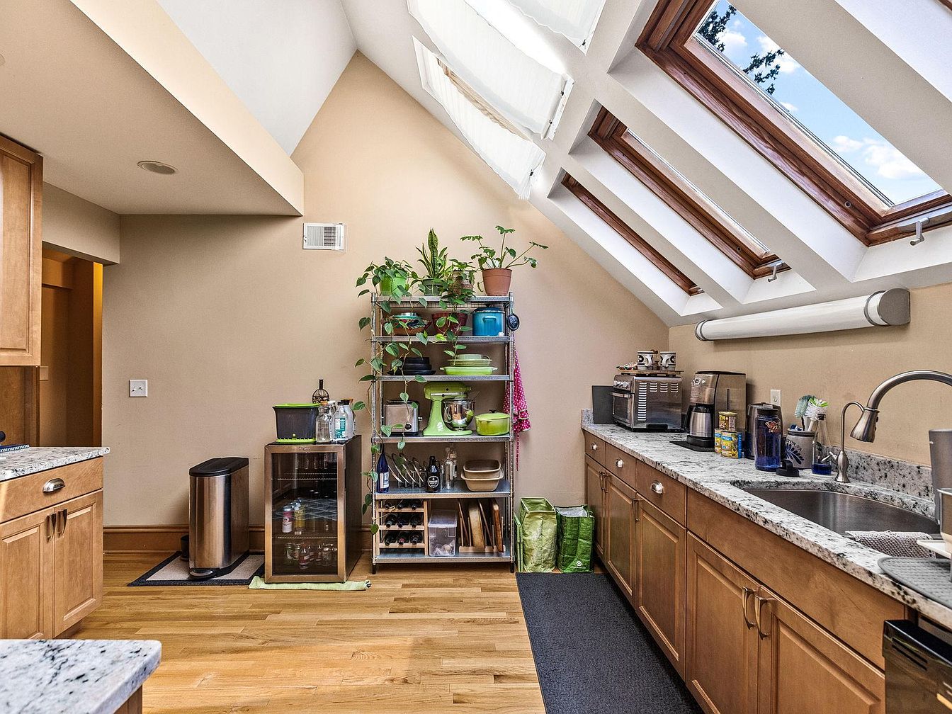 A bright and airy kitchen features a sloped ceiling lined with four large skylights, allowing ample natural light to pour in. The walls are painted a soft beige, enhancing the warm ambiance created by honey-toned wooden cabinetry along the right side. The countertops are a light-colored granite, housing a stainless steel sink and various appliances, including a coffee maker and espresso machine. A metal shelving unit at the end holds vibrant green dishware, plants, and kitchen accessories, while a glass-fronted mini fridge and recycling bins add practicality. The natural wood flooring and lush houseplants contribute to a cozy, inviting atmosphere.