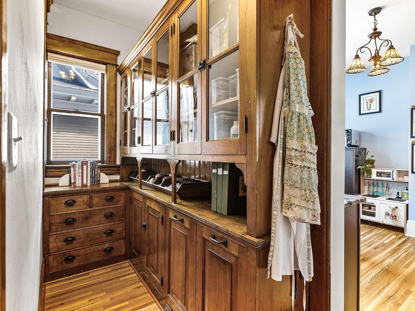 Narrow butler’s pantry featuring rich, honey-toned wood cabinetry with simple black handles and extensive glass-fronted upper cabinets for showcasing dishes and pantry items. Below, drawers and panel-front lower cabinets provide ample concealed storage, set atop a warm, golden hardwood floor. An old-fashioned apron hangs on a hook by the doorway, adding a nostalgic touch. A grouping of cookbooks sits neatly in a corner by a double window framed in matching wood, letting in natural light. Architectural details blend classic craftsmanship with utility, while a glimpse into an adjacent blue-walled kitchen hints at a cozy, lived-in, historic home.