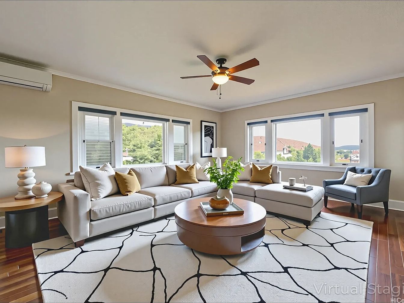 A spacious corner living room features expansive windows on two sides, flooding the space with natural light and offering views of greenery and rooftops outside. The walls are painted a soft beige, complementing the light gray sectional sofa adorned with mustard yellow and white throw pillows. A round, wooden coffee table sits at the center on a modern white rug with black abstract lines. A blue tufted accent chair and round side tables—one holding a sculptural lamp—add charm. Overhead, a wooden ceiling fan with a warm light fixture completes the inviting, contemporary look marked by clean lines and subtle contrasts.