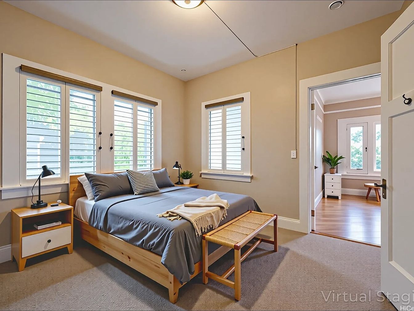 Cozy bedroom with soft beige walls and carpeted flooring. Three large windows line one wall, framed in white, letting in abundant natural light filtered through white plantation shutters. The bed features a light wood frame with slate gray bedding, complemented by neutral striped accent pillows. Each side of the bed has a matching nightstand with a black desk lamp. A woven bench sits at the foot of the bed, adding warm texture. Through an open door, a glimpse of an adjacent sitting room reveals hardwood floors, a white dresser, a potted plant, and similar Craftsman-style windows, maintaining continuity in the home’s historic charm.