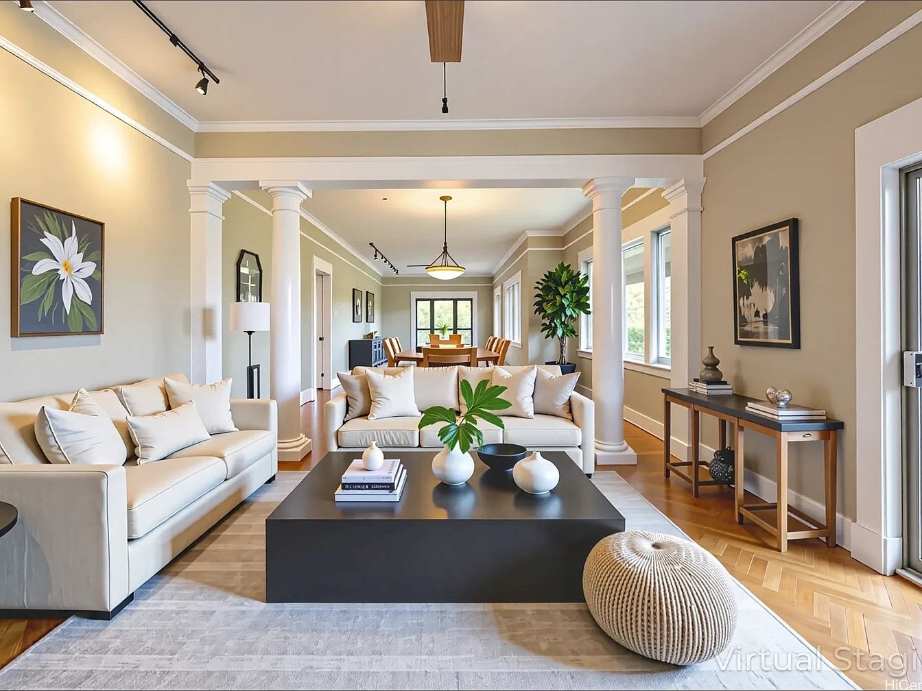 A spacious living room with soft beige walls and white trim, featuring classic architectural columns that elegantly divide the sitting area from the adjacent dining space. Two cream-colored sofas with matching throw pillows face a low, square black coffee table adorned with decorative vases and books. A textured, round knitted pouf rests on a light area rug. The room is accentuated by natural light from large windows along one side and complemented by sleek track lighting above. Minimalist wall art, a slim console table with decor, and a leafy green plant provide subtle contrasts and fresh, contemporary style.