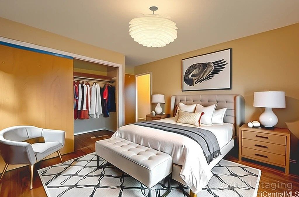 Warm, earth-toned walls create a cozy atmosphere in this bedroom, which features a mid-century modern aesthetic. A tufted headboard anchors the bed, which is layered with crisp white and gray bedding. There’s a geometric-patterned area rug beneath the bed, accompanied by a soft, upholstered bench at the foot. On either side, matching wooden nightstands hold sleek white lamps with classic shades. The open closet reveals neatly hung clothes behind a sliding wooden door. A modern white accent chair with curved arms sits in one corner, while a sculptural wing print provides stylish wall art above the bed.