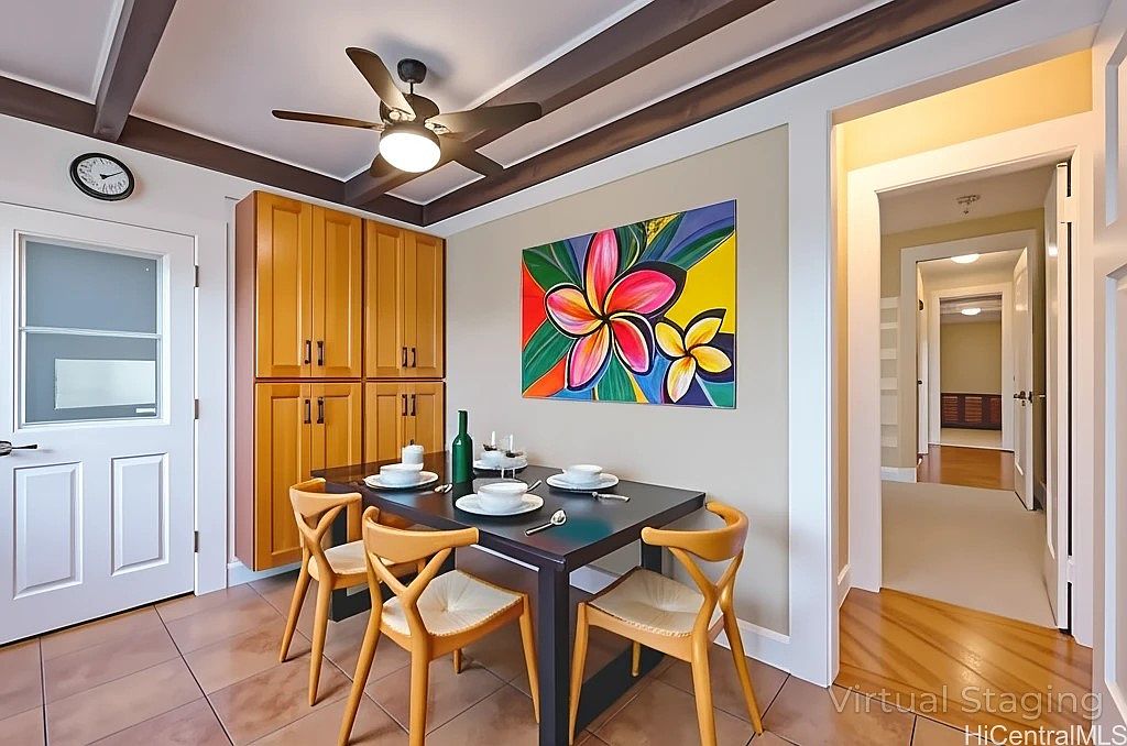 A compact dining area features a square black dining table set for four, with light wooden chairs that have woven seats, arranged on a tiled floor. Bright goldenrod cabinetry lines one wall adding a warm, rustic feel, while a colorful floral painting with vibrant pinks, yellows, and greens serves as a cheerful focal point. The white-paneled door and a wall clock add functional details. Ceiling beams painted dark brown contrast with the lighter ceiling, complemented by a ceiling fan with a central light. The space opens to a softly lit hallway with warm neutral walls and wood and white trim accents, blending contemporary and inviting homey vibes.