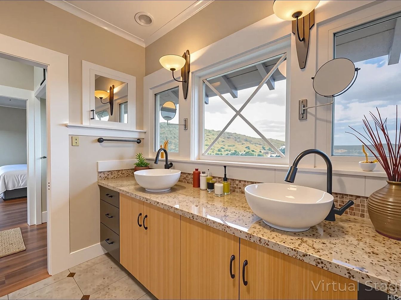 A spacious bathroom vanity area features light wood cabinetry with black handles and a beige speckled countertop. Two modern vessel sinks with sleek black faucets sit side by side, accompanied by a mix of practical items—soap dispensers, a small plant, and reed diffusers. Above each sink, simple white-framed mirrors hang on pale tan walls, flanked by contemporary wall sconces providing warm illumination. Large windows directly above the counter allow abundant natural light, showcasing views of green hills outside. Light tile floors and clean white trim complete the look, while a glimpse of an adjoining bedroom with wooden floors adds warmth and connection.