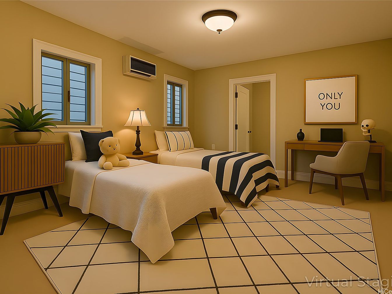 A cozy bedroom with warm beige walls and trim in crisp white. Two twin beds are placed side by side, each dressed in light-colored bedding—one with a navy and white striped throw blanket and the other with a plush teddy bear atop crisp linens. A mid-century modern nightstand with a potted plant and table lamp sits between the beds. On the right wall, a simple wooden desk with a gray upholstered chair provides a workspace, topped with decorative vases and a quirky skull model. The room features two square windows, a geometric area rug, and soft, ambient lighting.