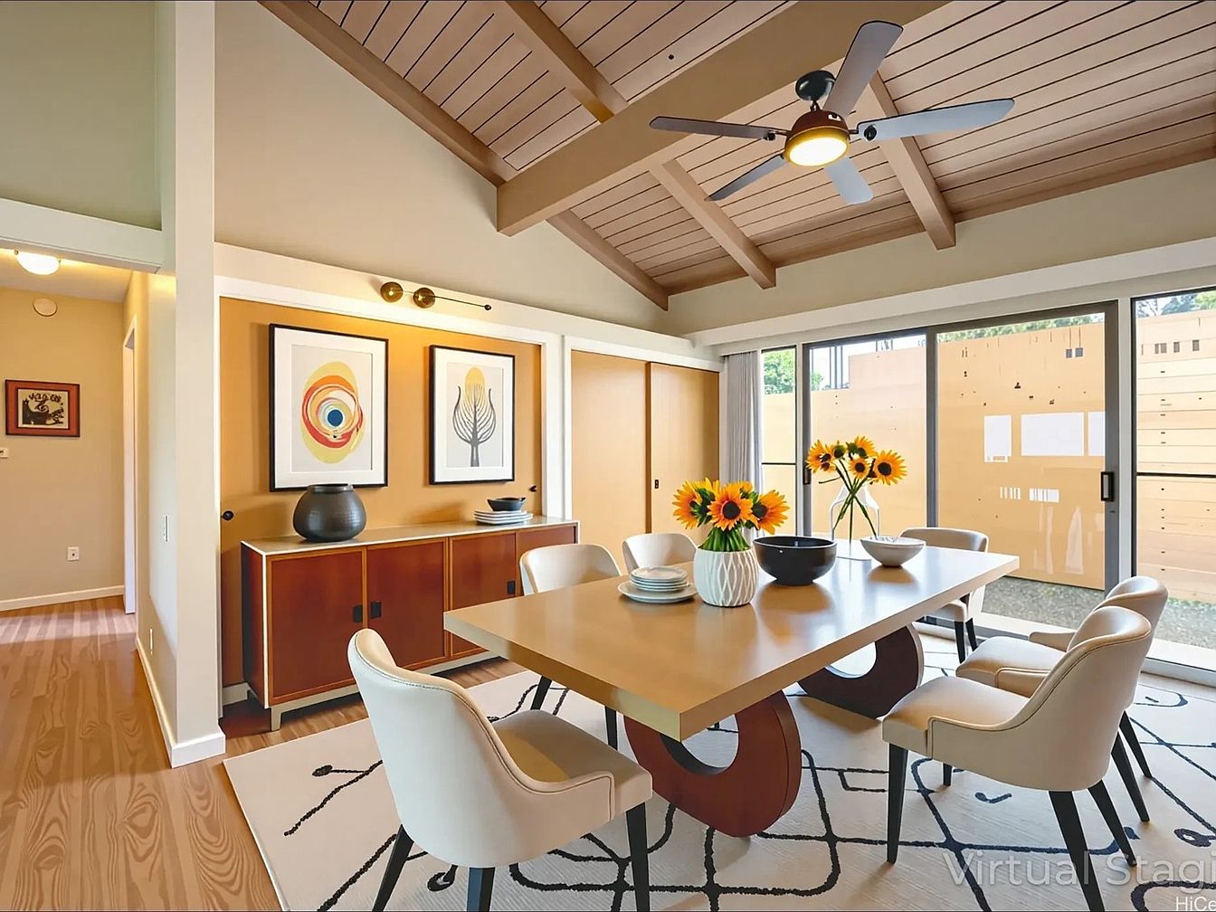 A spacious dining room with a high, vaulted wood-paneled ceiling and exposed beams painted in soft taupe. The room features a large rectangular table with sculptural wood legs, surrounded by six upholstered, white-cushioned chairs. On the table, two vases of sunflowers serve as cheerful centerpieces. A mid-century style sideboard with dark wood doors sits against the accent wall, topped with ceramics and under two pieces of modern abstract art in black frames. The floor has a white area rug with black line patterns. Full-height sliding glass doors lead outside, letting in abundant natural light and showcasing a fenced patio.