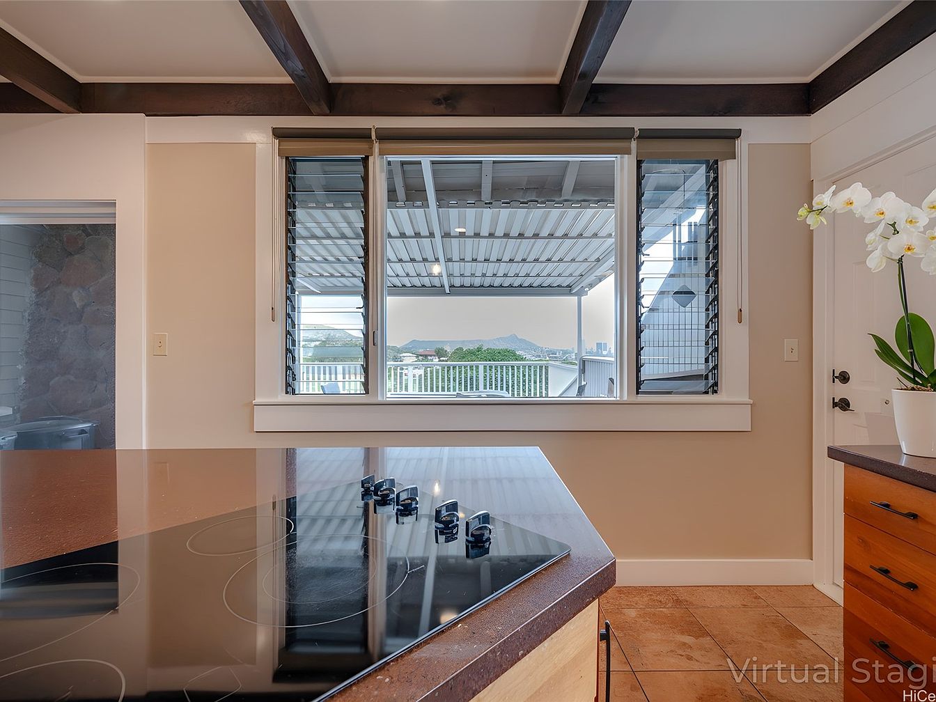 A kitchen space with a central feature being a sleek black electric cooktop built into a large, brown countertop island. Warm taupe walls pair with honey-toned tile flooring, while exposed dark wood ceiling beams add architectural interest overhead. Directly ahead, a large window framed in white trim brings in ample daylight and looks out onto a covered porch with distant cityscape and mountain views. The window has both standard and louvered panels for ventilation. In the corner sits a small wooden cabinet topped with a potted white orchid, adding a fresh touch to the elegant, airy environment.