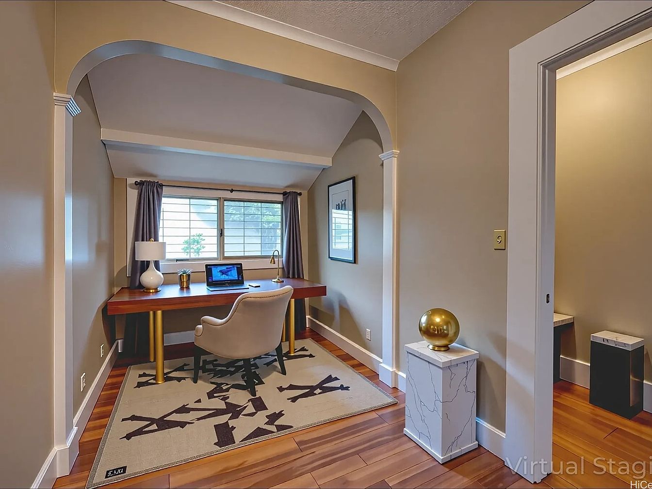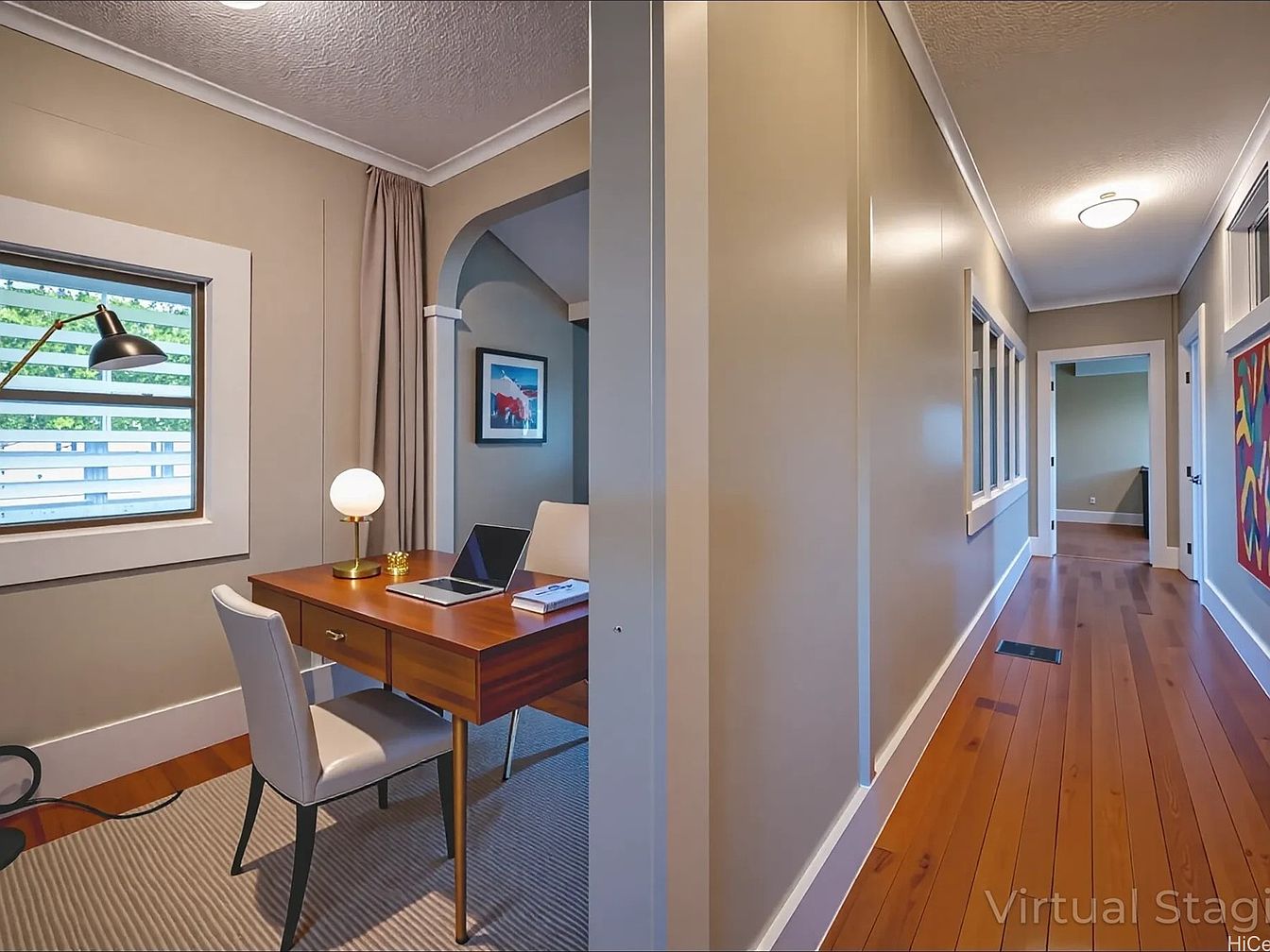 A home office is nestled by a window with horizontal blinds, letting in natural light. The office features a modern wooden desk with a brass desk lamp, a laptop, and a white cushioned chair. The neutral beige walls and white trim add an airy, sophisticated feel. Adjacent to the office is a long hallway with polished wooden floors and cream-colored walls. Recessed lighting and a unique colorful abstract painting enhance the space. Archways and broad mouldings hint at historic charm, while minimalist decor and clean lines evoke a blend of classic and contemporary aesthetics.
