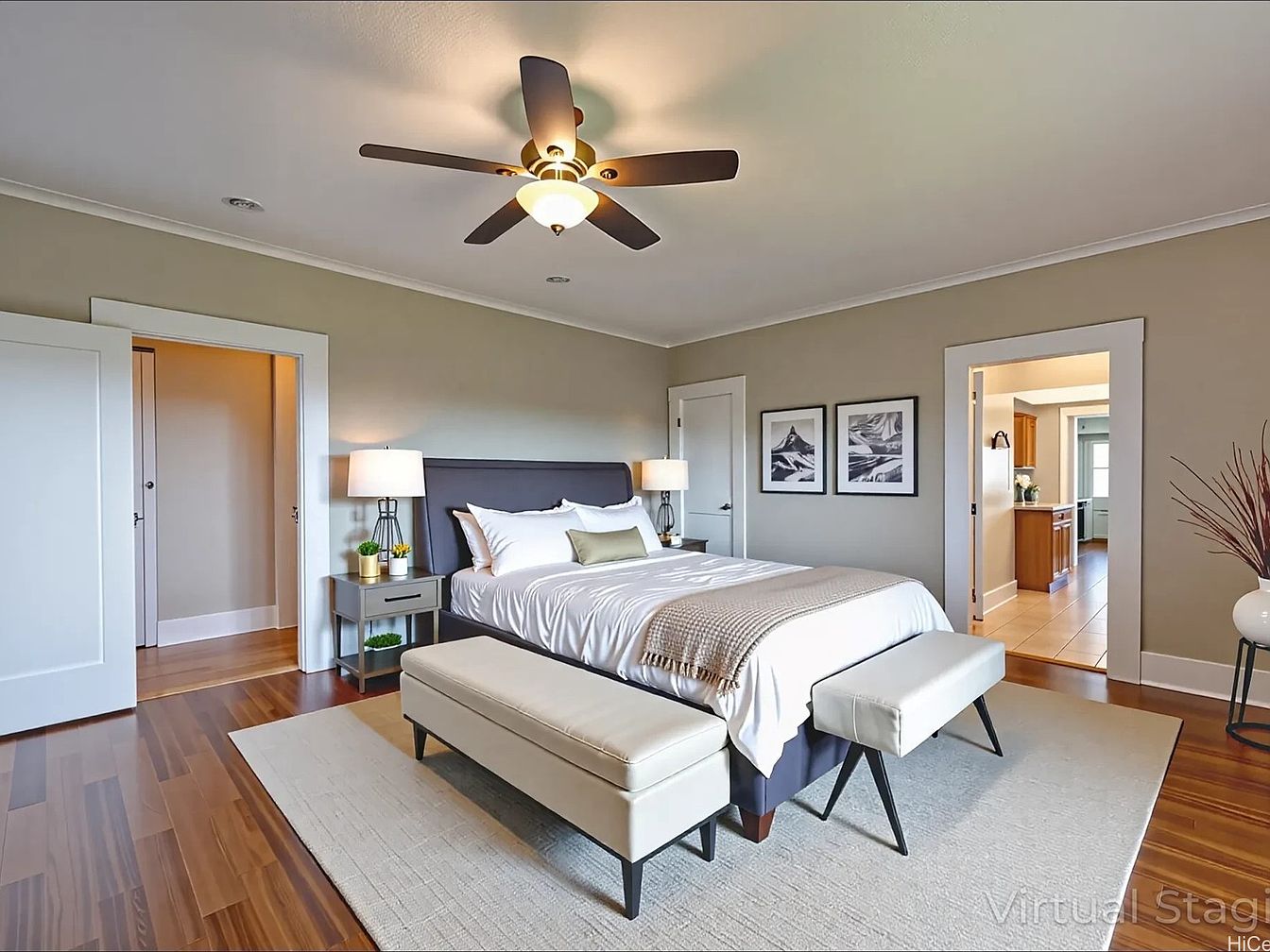 A spacious, softly lit bedroom with warm neutral tones. Pale beige walls are accented by crisp white trim and doors, giving the room a clean, timeless feel. A king-sized bed with a dark upholstered headboard stands centered against the main wall, flanked by matching nightstands holding modern lamps and small green plants. Two padded benches sit at the foot of the bed atop a large cream-colored area rug. The hardwood floor brings warmth to the space, while above, a contemporary ceiling fan provides a focal point. Three monochrome art prints hang above the headboard, and open doors reveal glimpses of an adjoining hallway and kitchen.