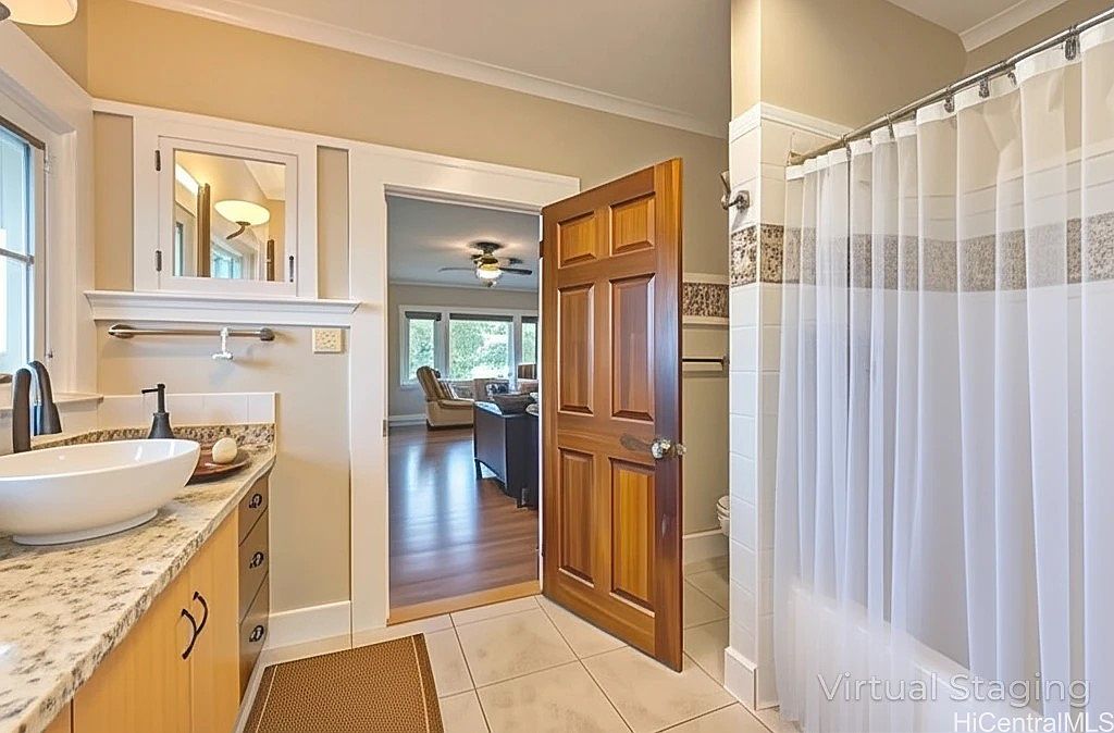 This bathroom features a warm, neutral color palette with pale yellow walls and white trim, creating a soothing atmosphere. The vanity has a speckled granite countertop with a vessel sink and a sleek black faucet, along with light wood cabinetry and brushed metal handles. Above the vanity, there are mirrored medicine cabinets with additional white trim and wall sconce lighting. A white tiled shower with a decorative patterned accent strip is enclosed by a clear shower curtain. The room opens to a living area with hardwood floors, modern ceiling fans, and large windows allowing sunlight to fill the adjoining spaces.