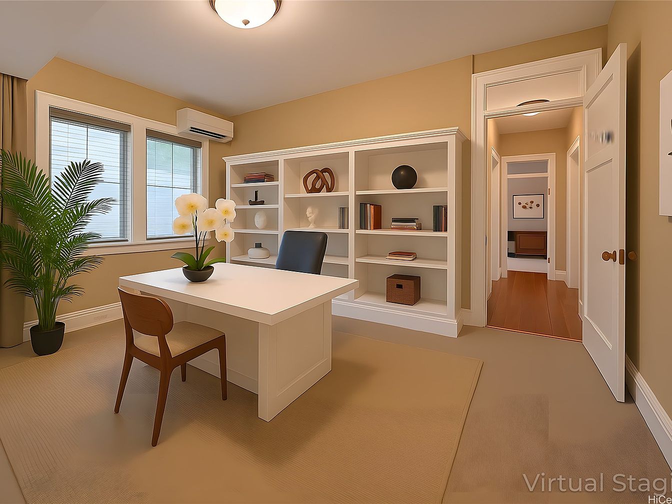 A neatly arranged home office features a large white desk centered on a beige area rug, topped with a black office chair and a wooden guest chair. A minimalist planter with white orchids adds a touch of freshness atop the desk. Against one wall, built-in white bookshelves display a mix of art objects, books, and storage baskets, providing both decor and utility. Two large windows with white trim allow natural light to brighten the space, complemented by an indoor potted palm in the corner. Soft tan walls, white ceiling moldings, and warm wood flooring in the adjoining hallway create a calm, inviting work atmosphere.