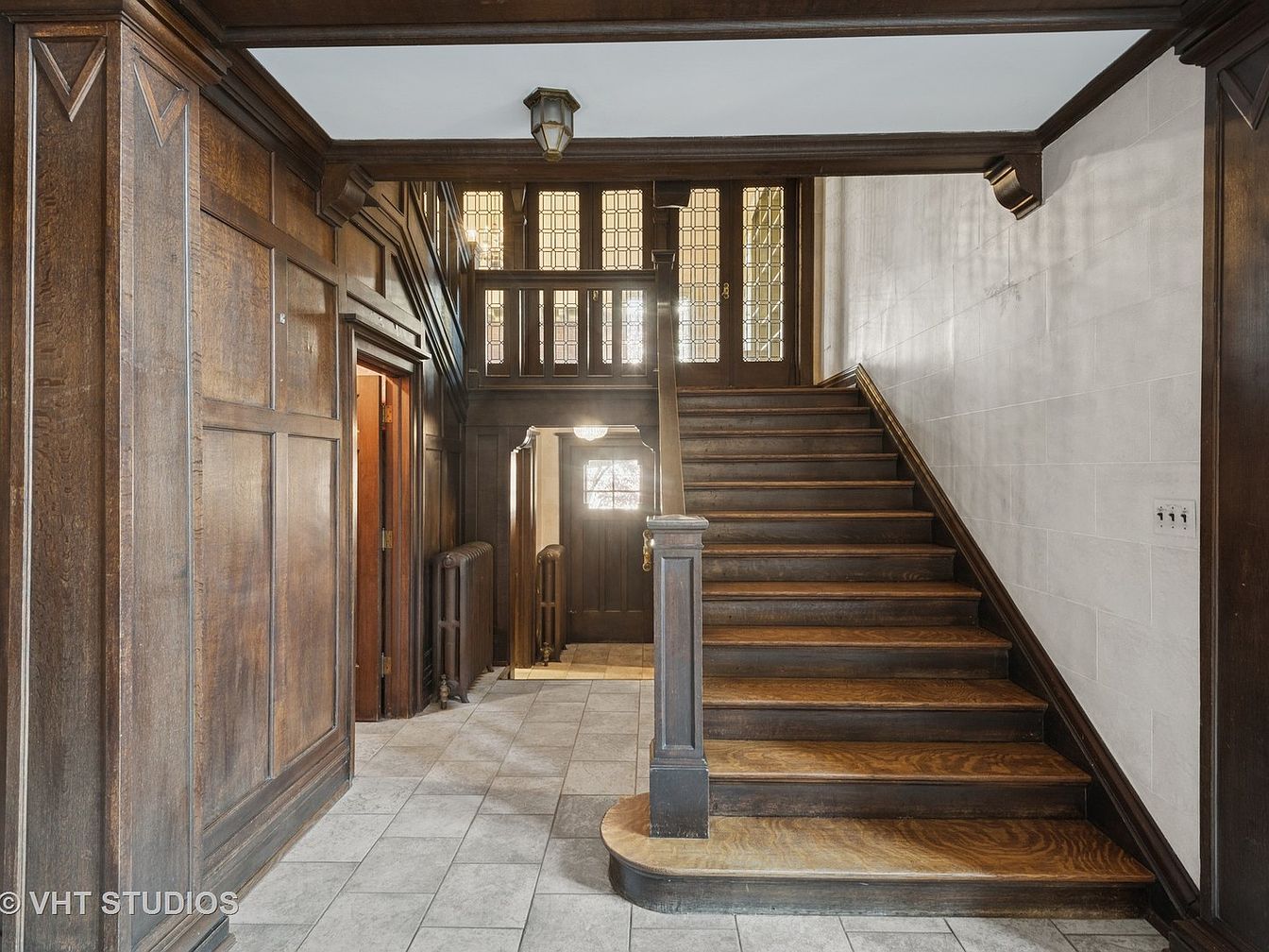 Spacious entryway featuring a grand wooden staircase on the right with rich, dark-stained wood steps and matching banister. The walls to the left are clad in paneled wood, enhancing the historic feel, while the right wall is lighter, possibly stone or plaster, offering contrast. The floor is tiled in a neutral tone, facilitating a clean, welcoming look. A small landing halfway up the stairs continues to an upper hallway lined with decorative glass windows set in more woodwork. Overhead, a simple, vintage-style lantern light fixture provides illumination. The overall atmosphere combines craftsman warmth with period authenticity.
