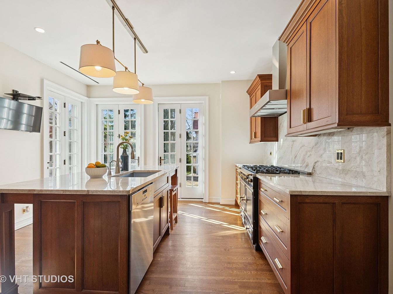 Rich wood cabinetry lines the kitchen, paired with marble countertops and a matching backsplash for a warm, classic feel. A central island with a sink and integrated dishwasher stands under three pendant lights with cream shades, providing sophisticated illumination. French doors and large windows flood the space with natural sunlight, creating an airy, inviting atmosphere. Stainless steel appliances, including a modern range beneath a sleek hood, add a contemporary touch. The oak flooring complements the cabinetry’s reddish-brown hue, and brass hardware adds an elegant accent. A bowl of fresh fruit and a tall vase offer subtle decorative touches.