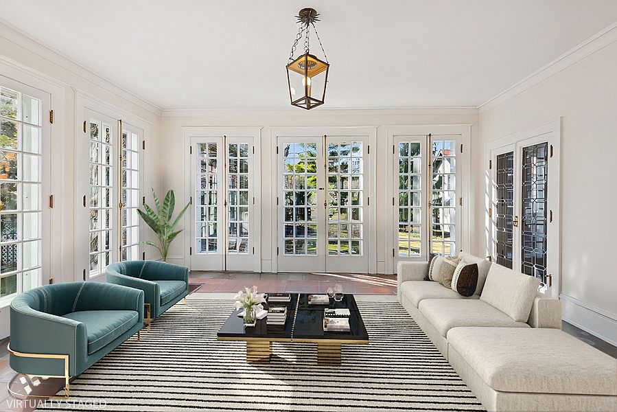 Bright and airy space featuring a wall of tall, multi-paned French doors that allow natural light to flood the room. The walls are painted a crisp white, complemented by a matching ceiling and wide white trim. Furnishings include a plush, L-shaped beige sofa facing a large, rectangular black coffee table with gold accents and decor items on top. Two teal, velvet armchairs with gold metal frames are set on the opposite side. A black-and-white striped area rug adds contrast and modern flair. A geometric gold pendant light hangs from the ceiling. A potted plant sits in the corner, enhancing the fresh aesthetic.