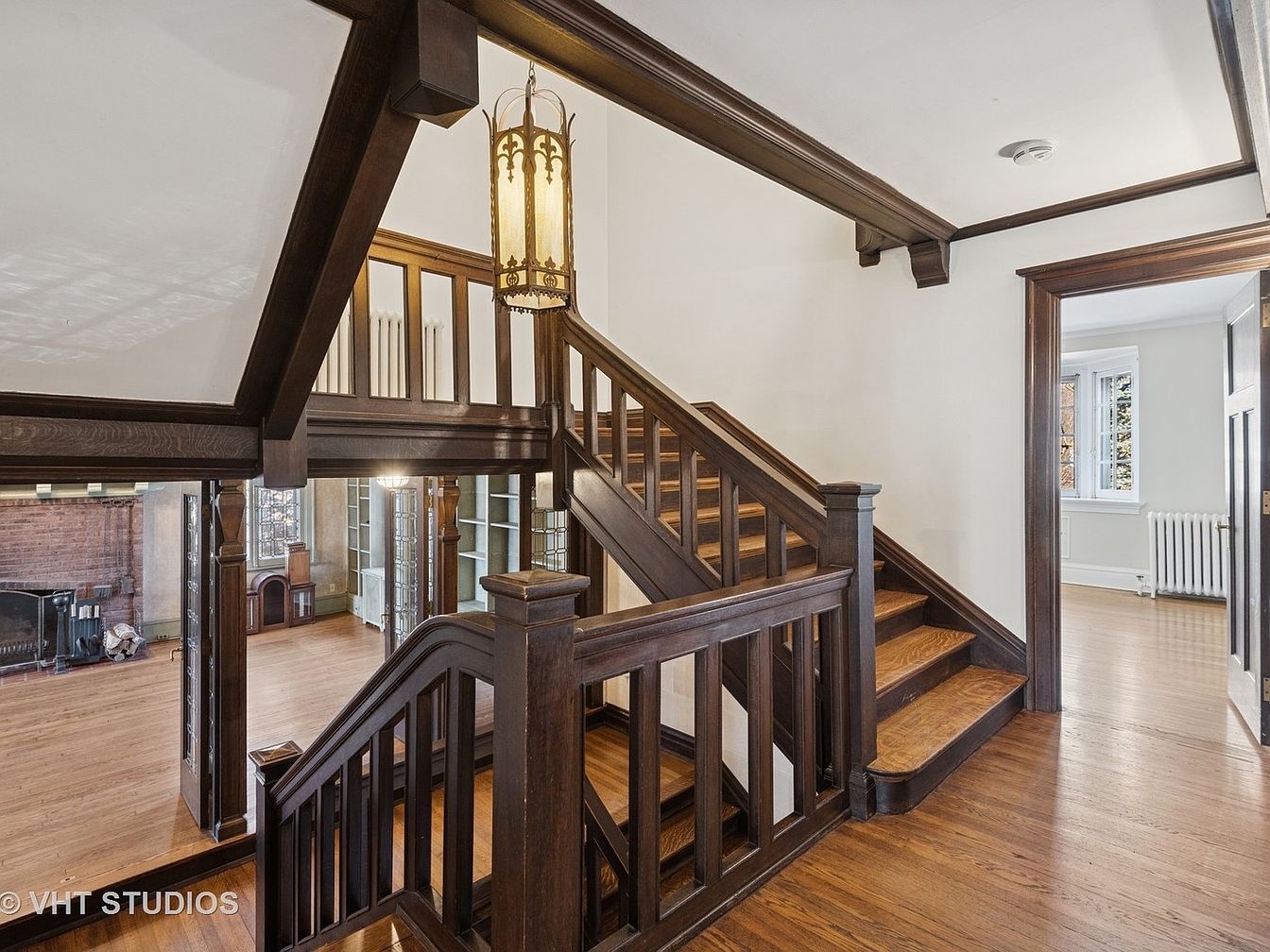 A central staircase with dark-stained wood railings and trim is the main feature, with broad steps leading both up and down. The flooring is medium-toned hardwood that matches the richness of the stairwell woodwork. A decorative, vintage-style brass chandelier hangs overhead, adding a warm glow to the white walls. Through open entryways, adjoining rooms are visible—a living area with a brick fireplace and built-ins, and another room with tall windows and a classic white radiator. The craftsmanship and details evoke early 20th-century architecture, with a cohesive aesthetic of sturdy wood and historic charm throughout the space.