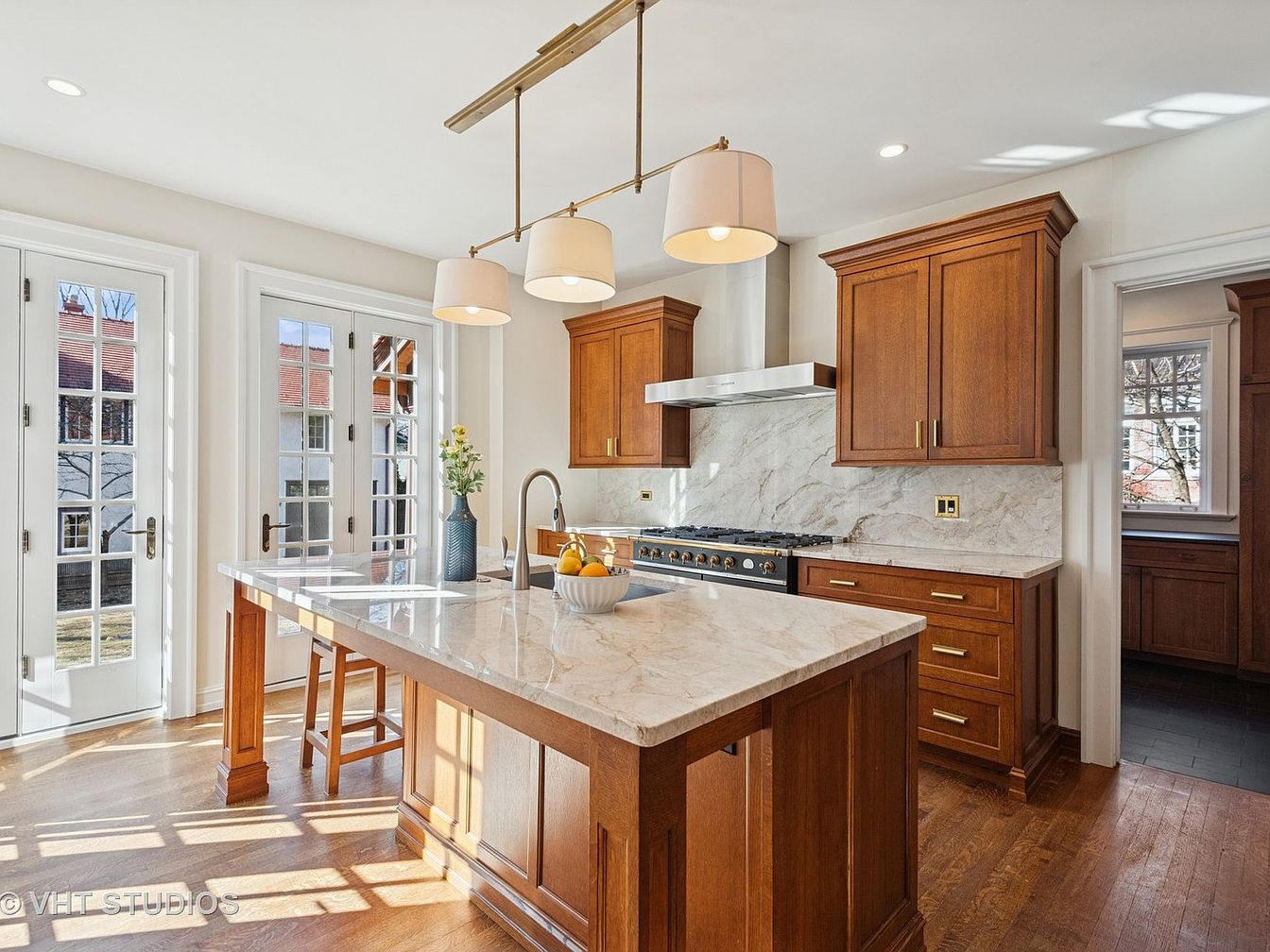 A sun-filled kitchen space with rich wooden cabinetry and a prominent marble island countertop. The countertops and backsplash are made from a light-colored stone that contrasts elegantly with the deep, warm tones of the wood. Three pendant lights with white drum shades hang above the island, adding a touch of contemporary flair. French doors on the left open to the outside, bringing in ample natural light that enhances the inviting atmosphere. Simple, brass hardware accents the cabinets, while a modern stainless-steel range hood and stove provide a sleek, professional touch. The overall feel is both classic and sophisticated.
