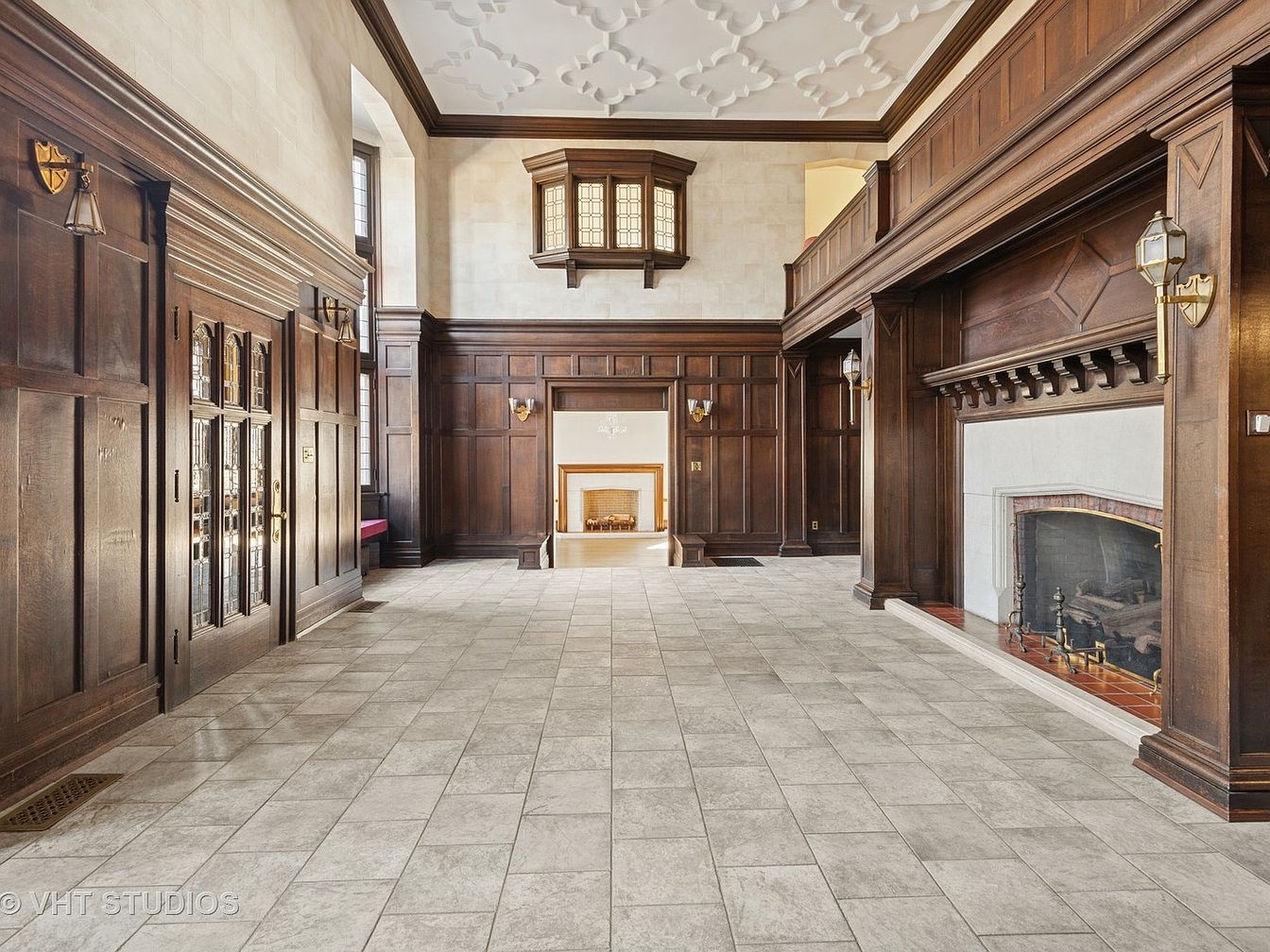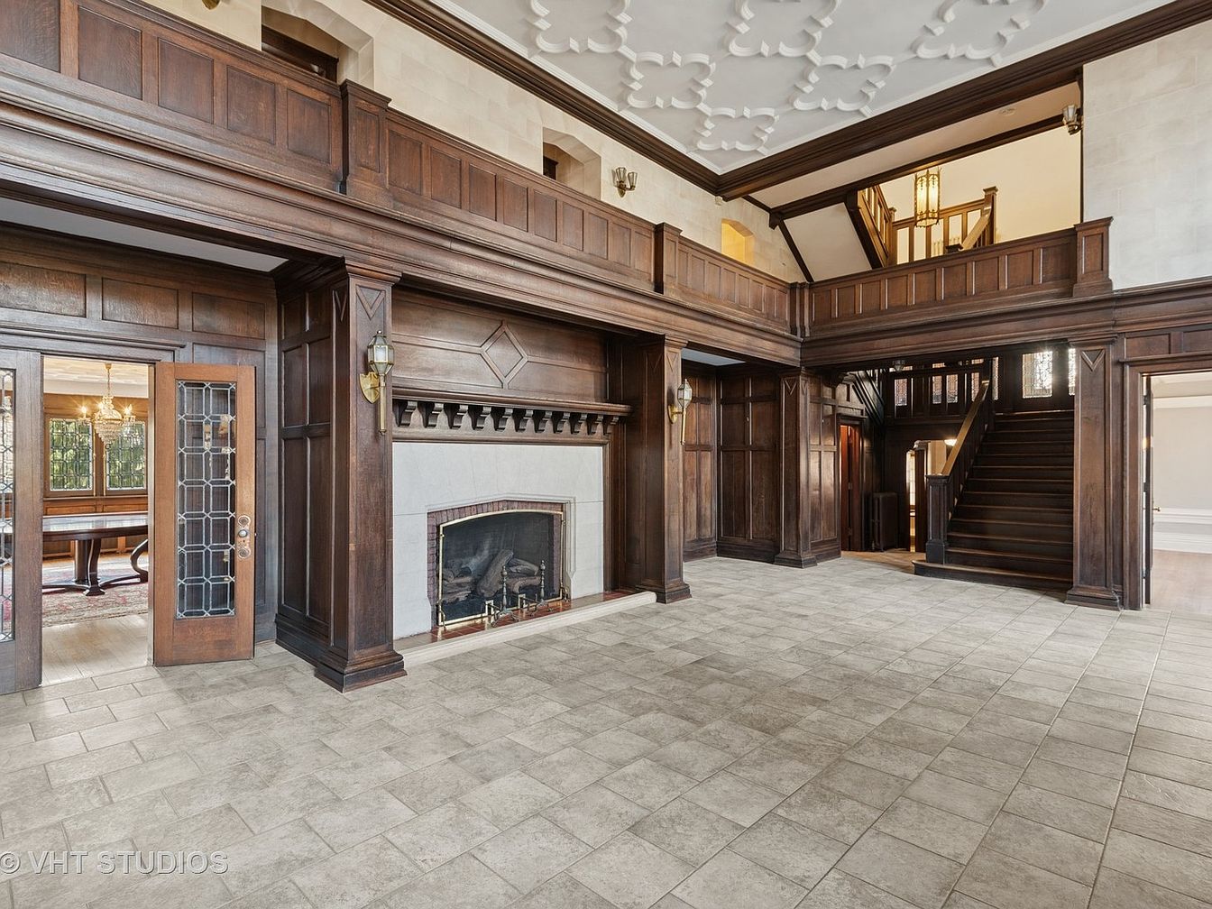 A spacious grand foyer features a dramatic dark wood paneling that frames the space, with a large fireplace as the central focal point. The fireplace has a light stone surround with ornamental brass fire tools and is set within an intricate wood mantle that extends toward a high, coffered ceiling adorned with detailed plaster patterns. To the left, decorative glass-paned double doors open to a formal dining room with a chandelier. A wide staircase with sturdy wood railings leads to a wood-paneled mezzanine, enhancing the sense of architectural grandeur and historic charm. The tiled flooring complements the dark wood tones.