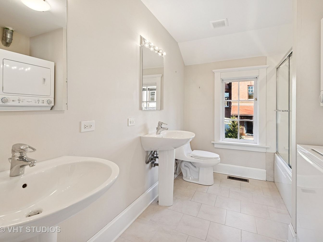 A bright and clean bathroom features a neutral palette with soft cream walls and large, light beige floor tiles. To the left, a modern white sink sits below a rectangular mirror, while a stacked washer and dryer is built into a recessed wall space above. Two identical vanities, each with sleek fixtures, face a large window that fills the room with natural light, offering a view of neighboring buildings. Across from the window is a glass-enclosed shower, highlighting modern updates to this historic space. Minimalistic design elements emphasize functionality and a sense of openness in this functional area.