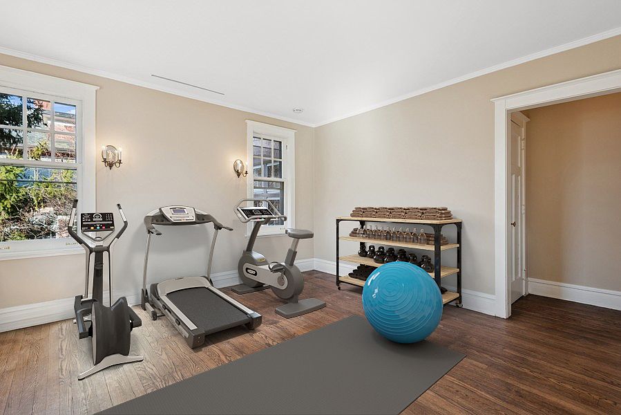 A spacious room with light tan walls and white trim, featuring two large windows that bring in ample natural light. The room has wood plank flooring and classic white crown molding. Along one wall, modern gym equipment—including a treadmill, stationary bike, and elliptical machine—are arranged neatly. A black metal rack holds rolled brown towels on the top shelf with a full set of hand weights organized below. In the center, a bright blue exercise ball and grey yoga mat add pops of color. Elegant sconce lighting fixtures provide soft illumination, emphasizing the room’s clean, airy aesthetic.
