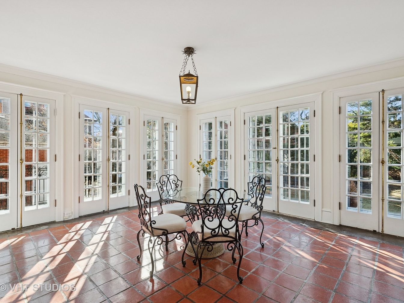 A bright and airy sunroom features walls of white French doors with multiple glass panes, allowing sunlight to pour in and providing panoramic views of the outdoors. The terracotta tile floor adds warmth and character, complementing the neutral white walls and ceiling. In the center, a round glass-top table surrounded by four black wrought iron chairs with white cushions creates an inviting spot for casual dining or conversation. A vase with fresh yellow flowers sits atop the table, while a classic lantern-style pendant light hangs from the ceiling, enhancing the elegant and timeless ambiance of this space.