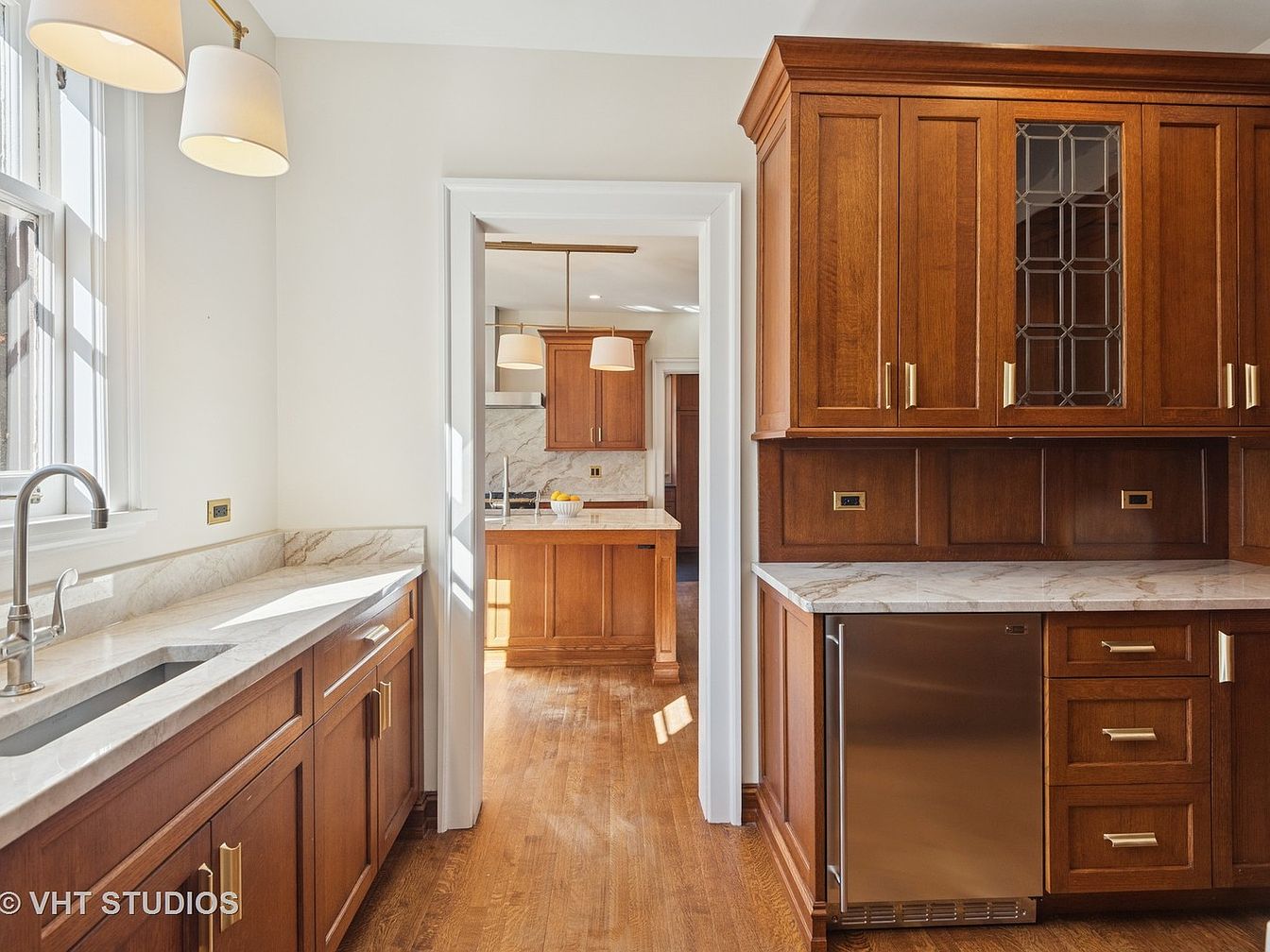 Warm wood cabinetry with brass bar handles fills the space, giving a classic yet elegant appearance. Light marble countertops stretch along both sides, combining practicality with sophistication. The left side features a deep under-mount sink beneath large, bright windows, allowing ample natural light to flood the room. Overhead, modern white pendant lamps cast a soft glow, complementing the neutral wall color. On the right, a built-in stainless steel under-counter fridge further enhances the room’s functionality. The cabinetry includes glass-front doors with leaded details, hinting at the home’s historic charm, while hardwood floors add continuity and warmth throughout the area.