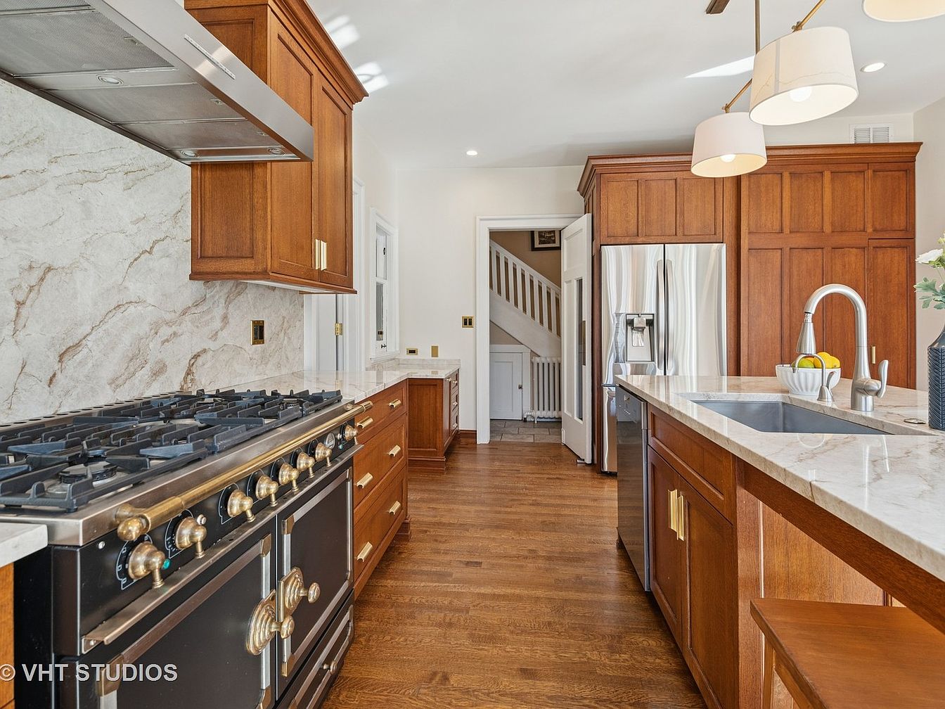 Warm, honey-toned hardwood floors run throughout the space, complemented by rich, wooden cabinetry with paneled doors and brass hardware. The countertops and backsplash are fashioned from veined white marble, creating a cohesive, elegant look. A large, commercial-style stove with brass accents anchors one side, while an island with a sink and stainless-steel dishwasher sits opposite, illuminated by modern pendant lights with white shades. Stainless-steel appliances, including a double-door refrigerator, add a contemporary touch. The open layout leads to a stairwell in the background, with natural light enhancing the kitchen’s sophisticated yet inviting atmosphere.