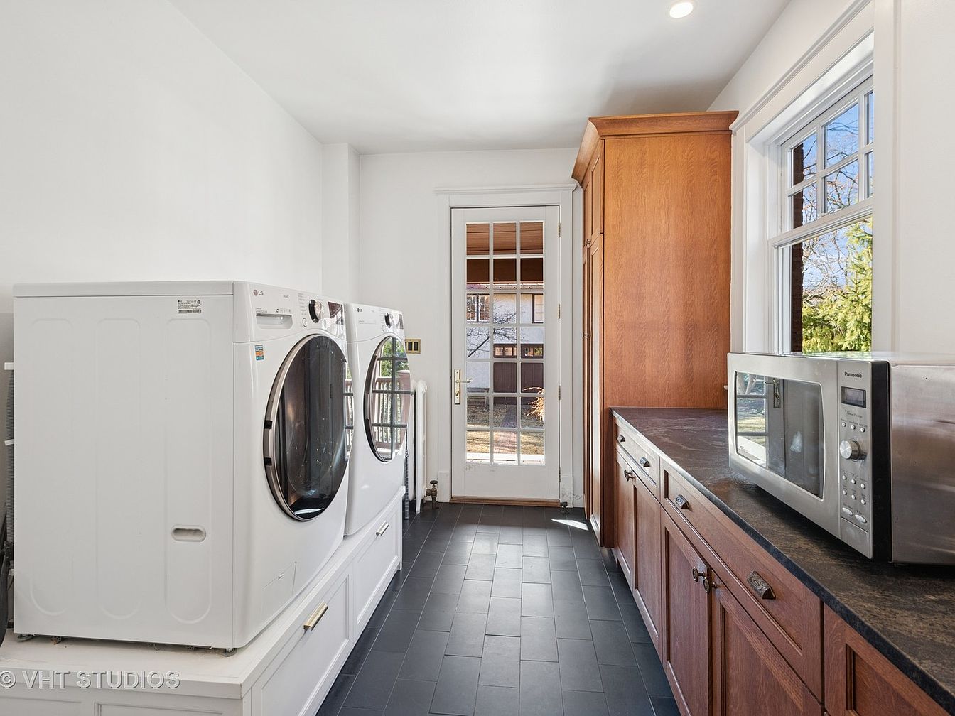 A bright and functional laundry room features sleek black tile flooring, white walls, and ample natural light streaming through a large window. A modern washer and dryer set with front-loading doors sits to the left atop a built-in white pedestal with brass hardware. Along the right wall, deep wood cabinetry offers storage beneath a dark stone countertop topped with a stainless steel microwave. A tall matching cabinet adds vertical storage near the back door, which has glass panes providing a glimpse of the exterior patio and garden space. The design blends utilitarian elements with warm, classic wood finishes.