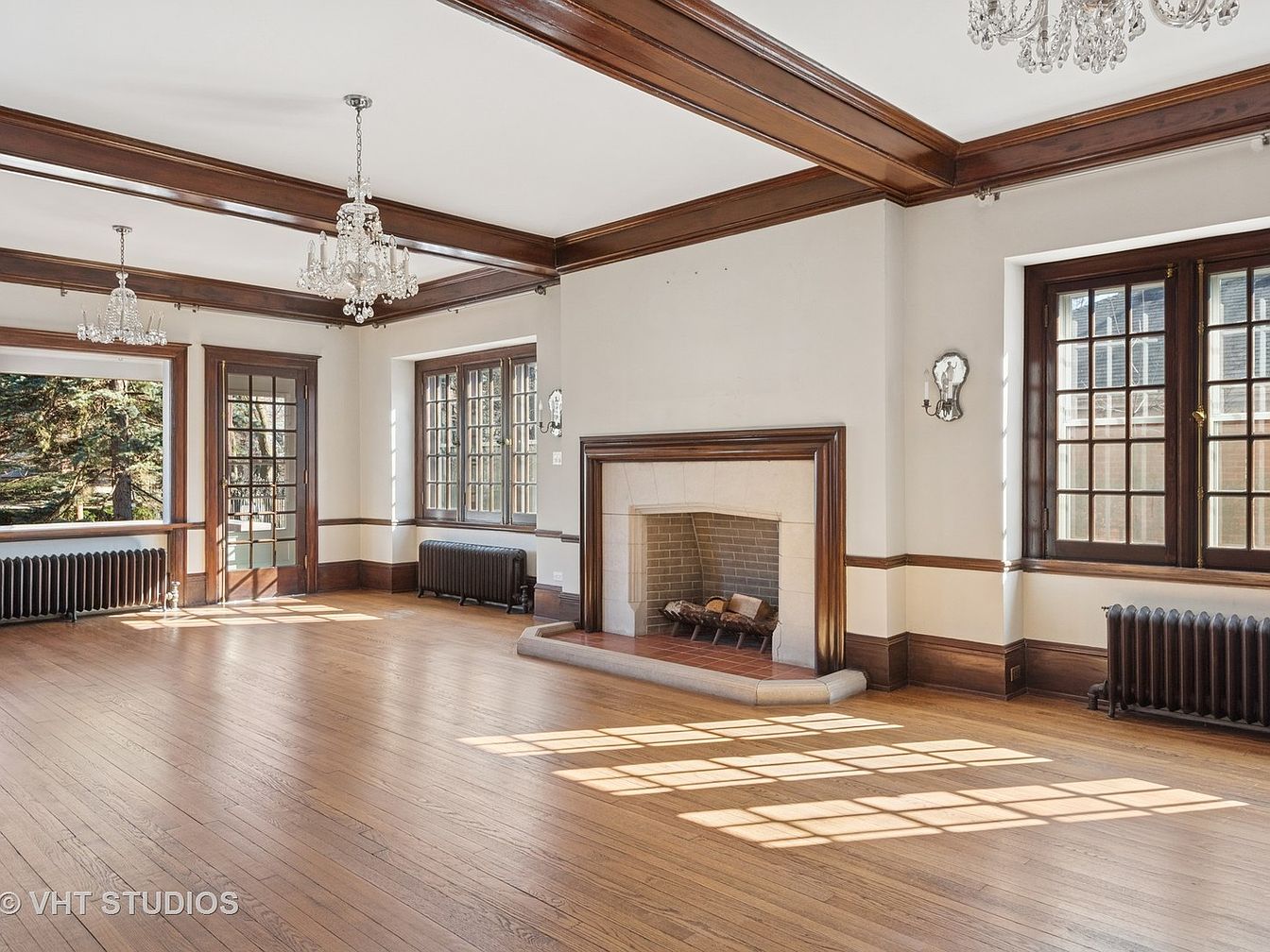 Expansive living room with high ceilings, showcasing exposed dark wood beams and two elegant crystal chandeliers. The space features large multi-pane windows and French doors along two walls, allowing abundant natural light to fill the room. The windows and door frames are trimmed in rich dark wood, matching the baseboards and crown molding for a cohesive historic look. A prominent stone fireplace with an inset firewood nook anchors one wall, bordered by minimal sconces. Light tan walls contrast with the warm wood flooring, and classic black radiators sit beneath the windows, enhancing the period charm of the space.