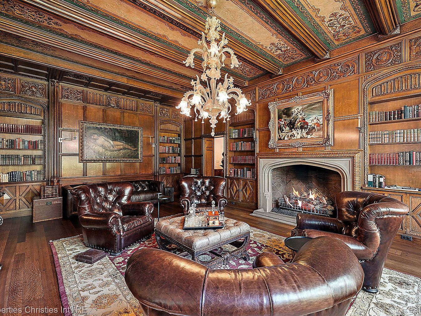 The stunning library lounge features rich, dark wood paneling that creates an elegant, warm ambiance. A grand chandelier hangs from an intricately designed ceiling, highlighting the ornate details. Comfortable, deep brown leather sofas are arranged around a central coffee table, offering an inviting space for conversation. The walls are lined with bookshelves filled with colorful books, adding intellectual charm. A large artwork above the fireplace showcases classic themes and is framed elaborately, while the fireplace itself adds warmth and coziness. A patterned area rug anchors the seating arrangement, enhancing the room’s luxurious feel.