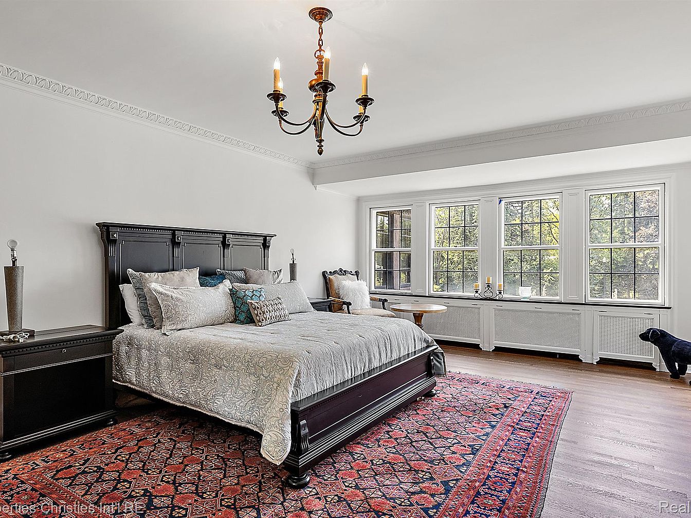 This spacious bedroom features a grand dark wood bed adorned with a plush grey quilt, surrounded by an array of decorative pillows. Flanking the bed are stylish nightstands with elegant lamps. A rich, Persian-style rug adds warmth and depth, contrasting beautifully against the hardwood floor. Large windows bathe the room in natural light, with a cozy window seat presenting a serene view. A classic chandelier hangs from a white ceiling with intricate crown molding, enhancing the room’s elegant aesthetic. Subtle accents, like a small round table and decorative candle holders, complete the inviting atmosphere.