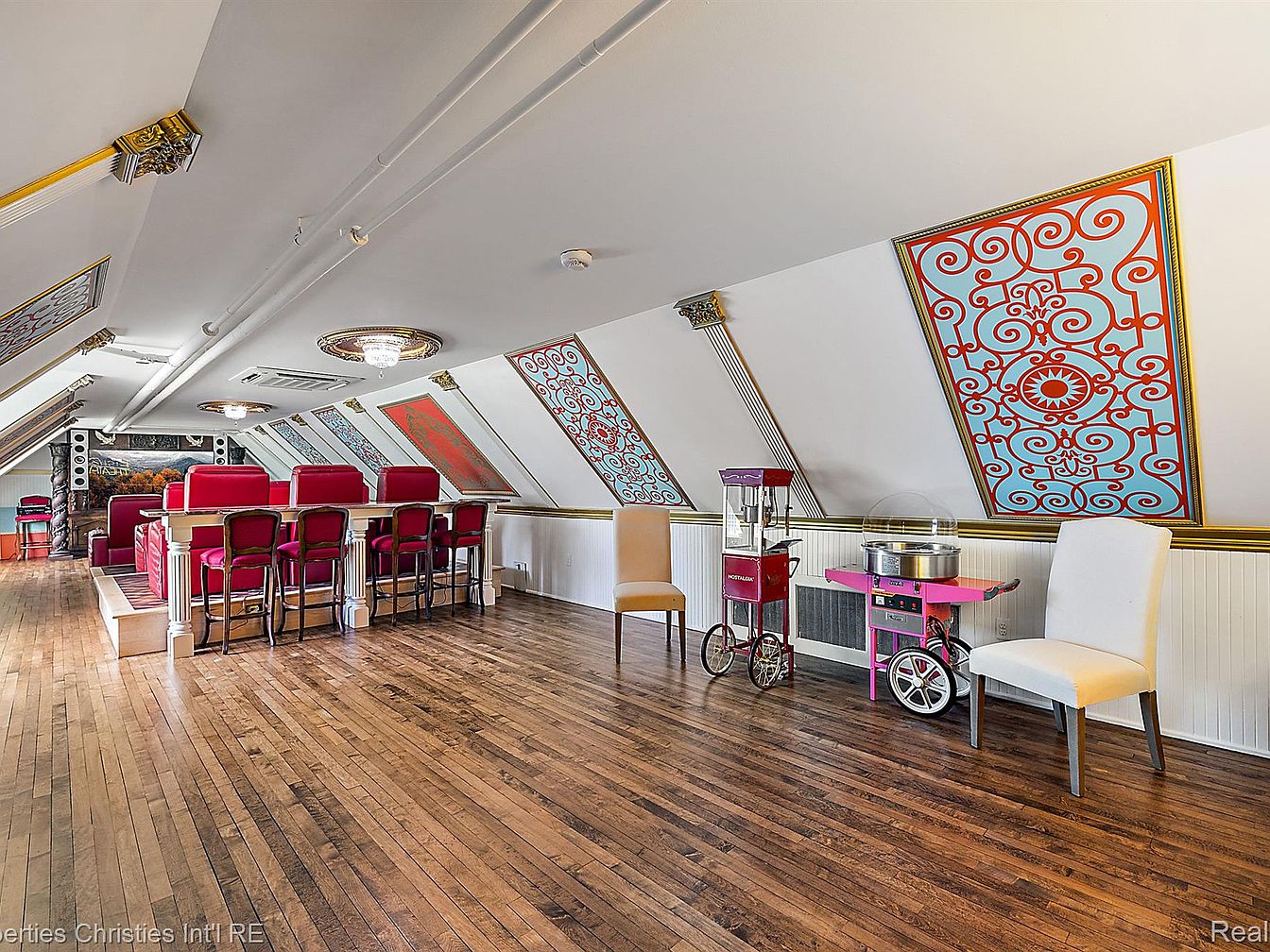 This unique entertainment loft features a spacious layout with sloped ceilings accentuated by vibrant, artistic accents. A bar area with high red stools invites gathering, complemented by a wooden countertop. Light wooden flooring enhances the bright, welcoming atmosphere. Colorful wall embellishments in turquoise and red add a playful touch, while a crystal chandelier provides a focal point of elegance. Alongside the bar, vintage-style popcorn and cotton candy machines sit ready for use, blending fun with nostalgia. This space is perfect for entertaining, showcasing both style and functionality in a historic home context.