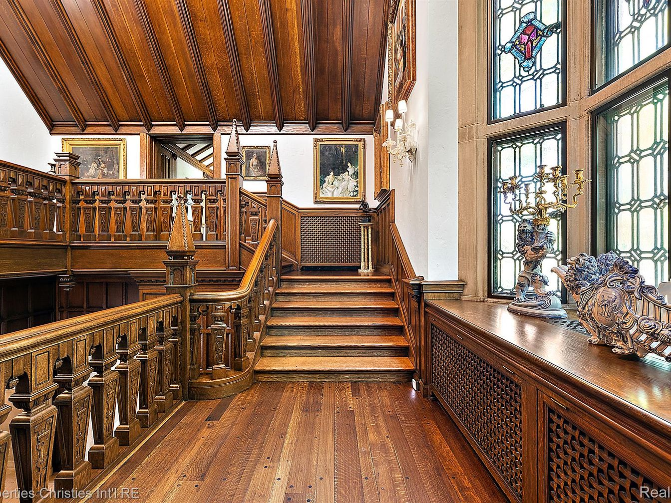 This grand entryway features rich, dark wood paneling that envelops the space, lending a warm, classic feel. An intricately carved staircase ascends from the lower level, flanked by elegant spindles that echo the craftsmanship throughout the home. A striking zebra-patterned rug sits on the tile floor, providing a modern contrast to the historical decor. Above, large windows adorned with stained glass illuminate the area with soft, colorful light. Framed artwork and vintage sconces on the walls add sophistication, while decorative elements like polished brass fixtures enhance the entry’s timeless elegance.