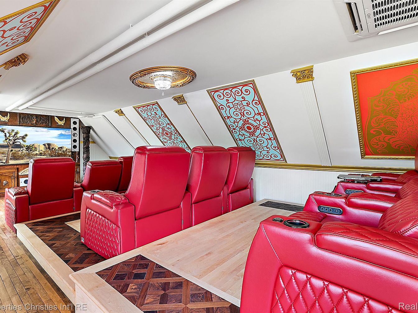 A luxurious home theater featuring plush, red leather recliners arranged in a cozy row, enhancing the cinematic experience. The raised platform and intricately patterned wooden flooring create a sophisticated ambiance. The ceiling showcases elegant architectural details with ornate molding and colorful wall art, drawing the eye upwards. A large screen occupies the back wall, adorned with decorative elements depicting a desert landscape, merging modern technology with classic design aesthetics. The combination of rich colors, comfortable seating, and artistic details crafts a unique space ideal for entertainment and relaxation, blending comfort with style.