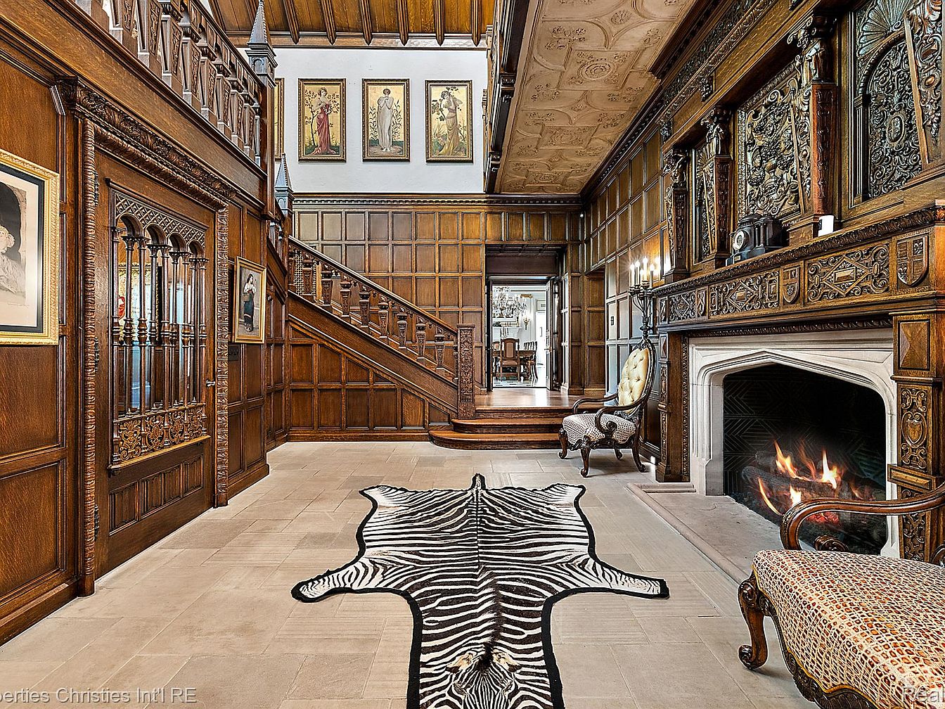 The foyer features rich, dark wooden paneling with intricate carvings that exude opulence and historical charm. Elegantly designed stair railings lead to a second floor, complemented by beautifully framed artwork above. A stylish zebra print rug contrasts against the stone floor, adding a modern touch to the traditional decor. A grand fireplace with ornate detailing serves as a focal point, inviting warmth with its flickering flames. A vintage chair, upholstered in intricate fabric, sits elegantly beside the fireplace, enhancing the room’s sophistication. Rich textures and a cohesive color palette create a welcoming entry into this historic home.