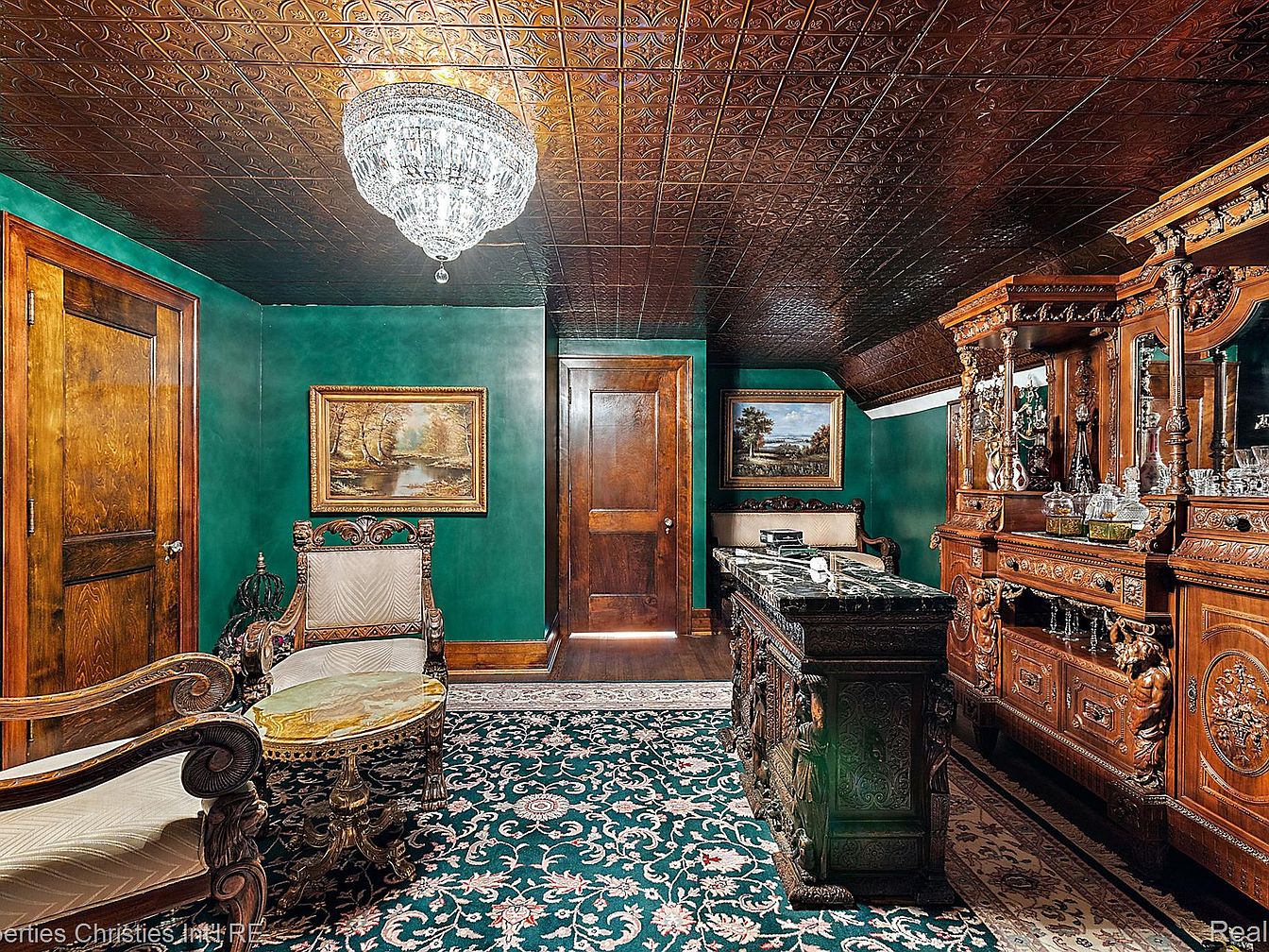 Rich emerald green walls surround the space, complemented by intricate wooden architectural elements. A textured tin ceiling reflects light, adding an elegant touch beneath a sparkling chandelier. Vintage furniture includes ornately carved chairs with plush upholstery, accentuated by a small side table adorned with a marble top. A dark wooden sideboard featuring exquisite carvings stands proudly along one wall, showcasing glass decanters and a framed landscape painting that brings warmth to the room. The floor is adorned with a soft area rug, richly patterned, creating a cozy ambiance that blends sophistication with historical charm.