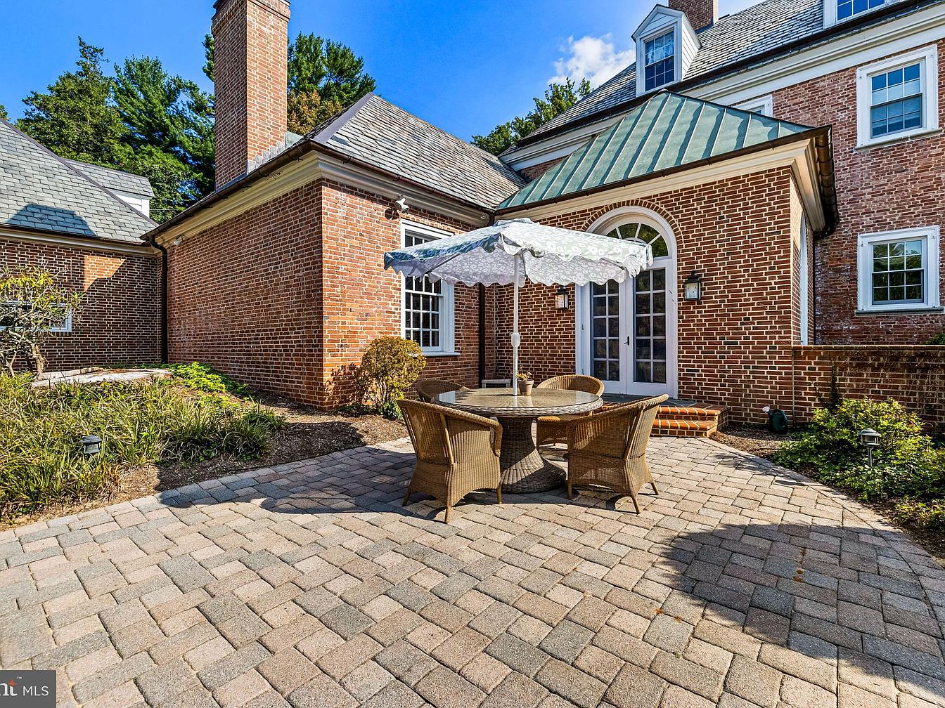 A spacious brick patio extends from the house, enclosed by classic red brick walls typical of historic American architecture. The patio sits on a grid of pale stone pavers, arranged symmetrically for a clean look. At the center, a round wicker table with four matching chairs provides outdoor seating under a white scalloped patio umbrella. French doors with an arched transom window lead into the home, framed by sidelights and traditional outdoor lanterns. Trimmed hedges and manicured planting beds border the patio, and the surrounding green trees lend a sense of privacy and tranquil outdoor living.
