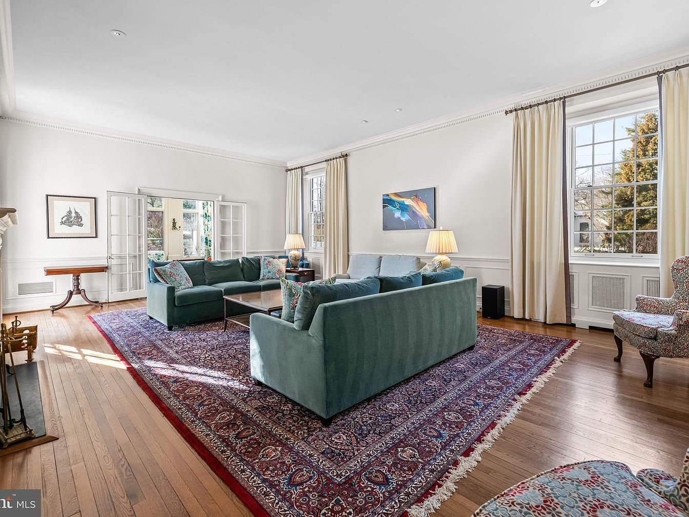 Spacious living room featuring two large seafoam green upholstered sofas arranged in an L-shape around a central glass coffee table. The seating sits atop an intricate, oversized Persian-style area rug in deep reds and blues, contrasting with the honey-toned hardwood floors. Light cream walls are accented with elegant crown molding and wainscoting. Natural light pours in through tall rectangular windows with cream drapes, highlighting artwork and lamps on side tables. A pair of floral-patterned armchairs and a classic wood side table rest near French doors, offering entrance to another sunny sitting area, while a traditional fireplace anchors one side of the room.