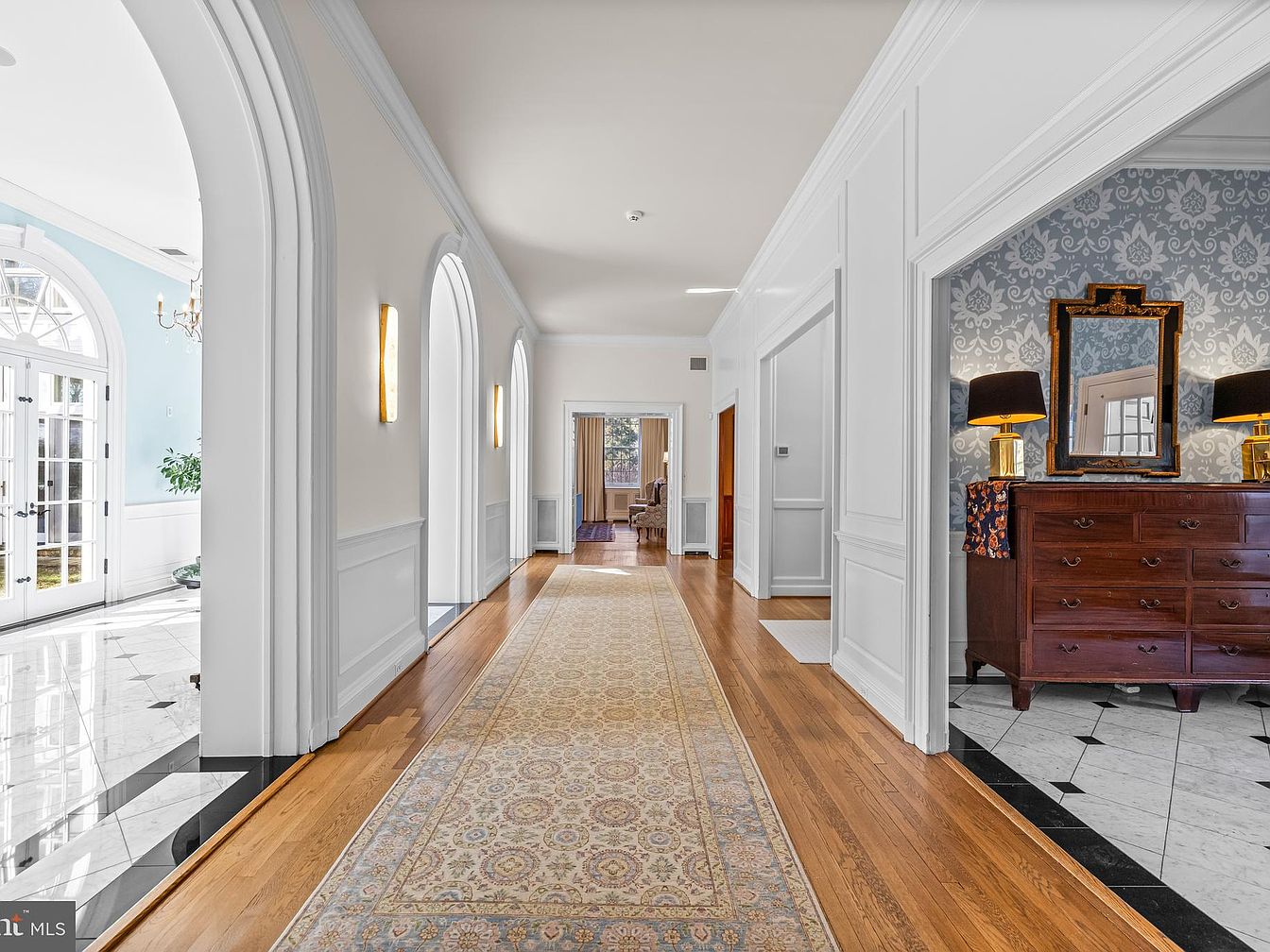 A grand, bright hallway runs the length of the home, featuring gleaming medium-tone hardwood floors and a long, ornate runner in pale gold and beige. Wainscoting and crown molding in crisp white give the space a classic, elegant feel. On the left, tall arched doorways lead into a sunlit room with light blue walls and French doors, while to the right, an opening reveals a room with patterned blue wallpaper, a vintage dresser, and two gold lamps. The overall aesthetic fuses traditional elements with a fresh, airy atmosphere, highlighted by abundant natural light and refined architectural details.