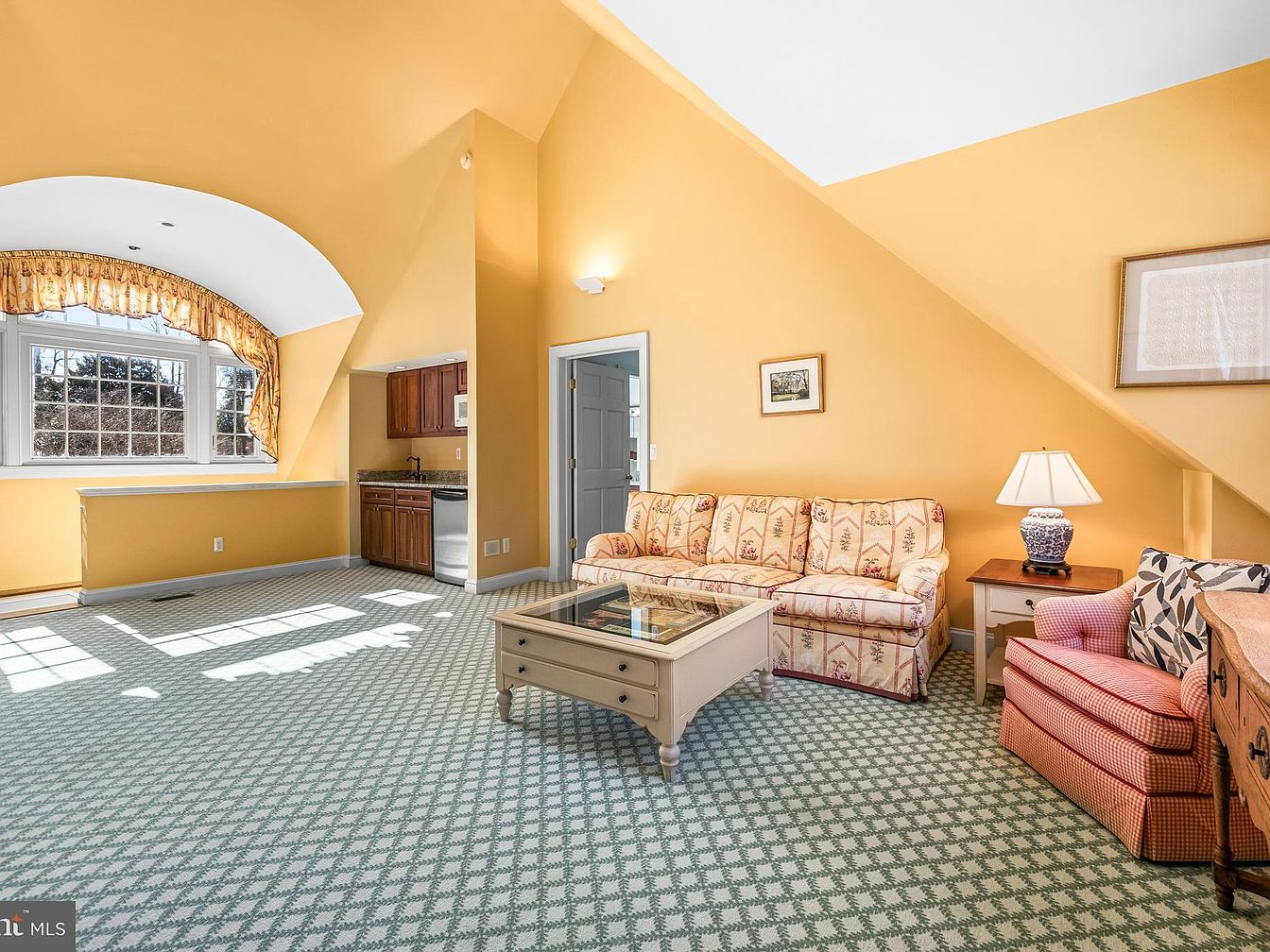 This cozy sitting room features vaulted yellow walls and high, angled ceilings that invite abundant natural light from a row of large, mullioned windows framed by gold floral drapes. The carpet has a pale mint-green geometric pattern for a soft, traditional feel. Against one wall, a peach and cream floral-patterned couch faces a cream coffee table with glass top. A side table with a blue ceramic lamp and a coral gingham armchair with a patterned cushion add to the inviting aesthetic. In the corner is a small wet bar with dark wood cabinetry, granite countertop, and a stainless steel mini-fridge.