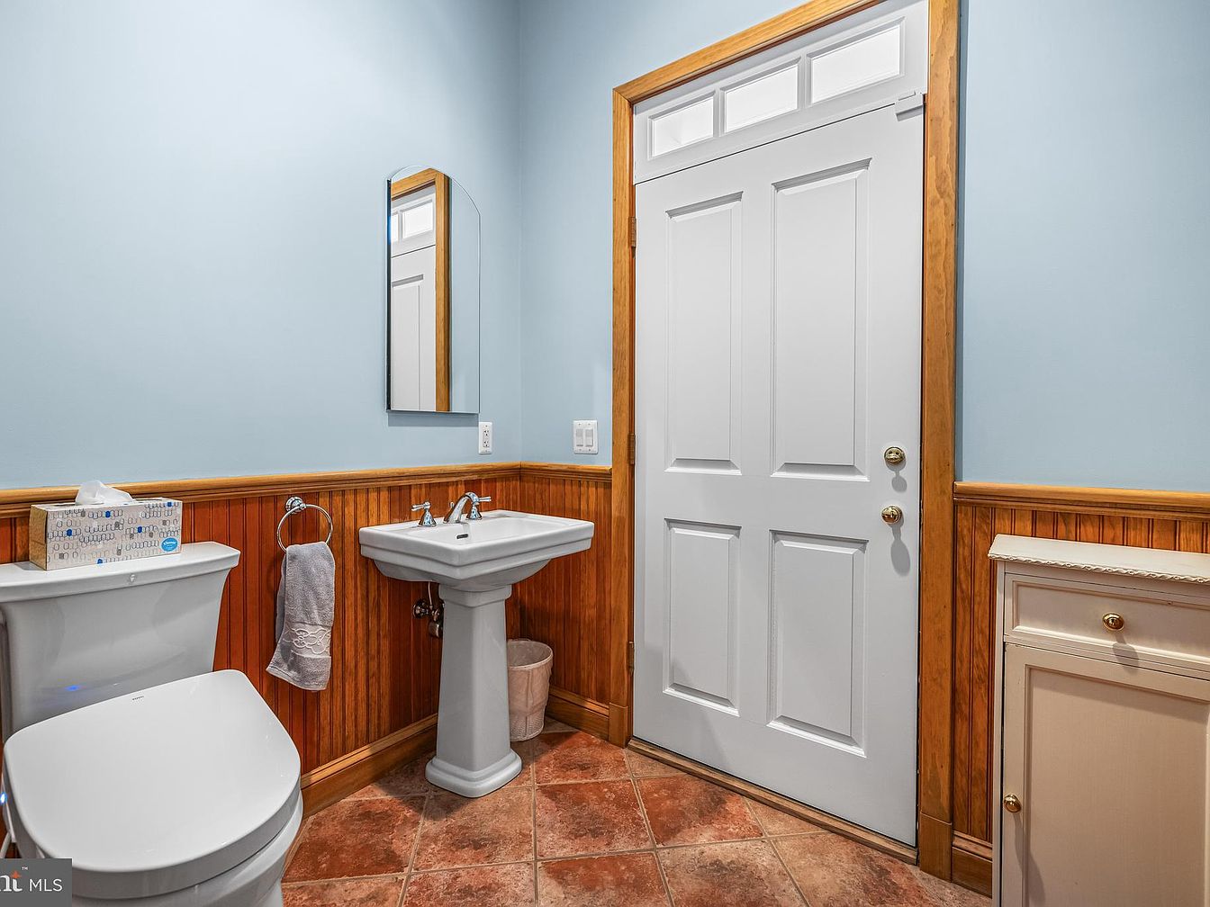 This bathroom features a classic design with light blue walls complemented by warm wood wainscoting that lines the lower half of the room. The flooring is styled with reddish-brown ceramic tiles set in a diagonal pattern, adding visual interest. A white panel door with clear glass transom windows is framed in matching wood trim for a touch of traditional charm. The furnishings include a pedestal sink with chrome fixtures, a modern white toilet, a simple mirrored cabinet above the sink, and a towel ring with a neatly folded towel. The cabinet to the right has a creamy finish with brass knobs, rounding out the vintage-inspired look.