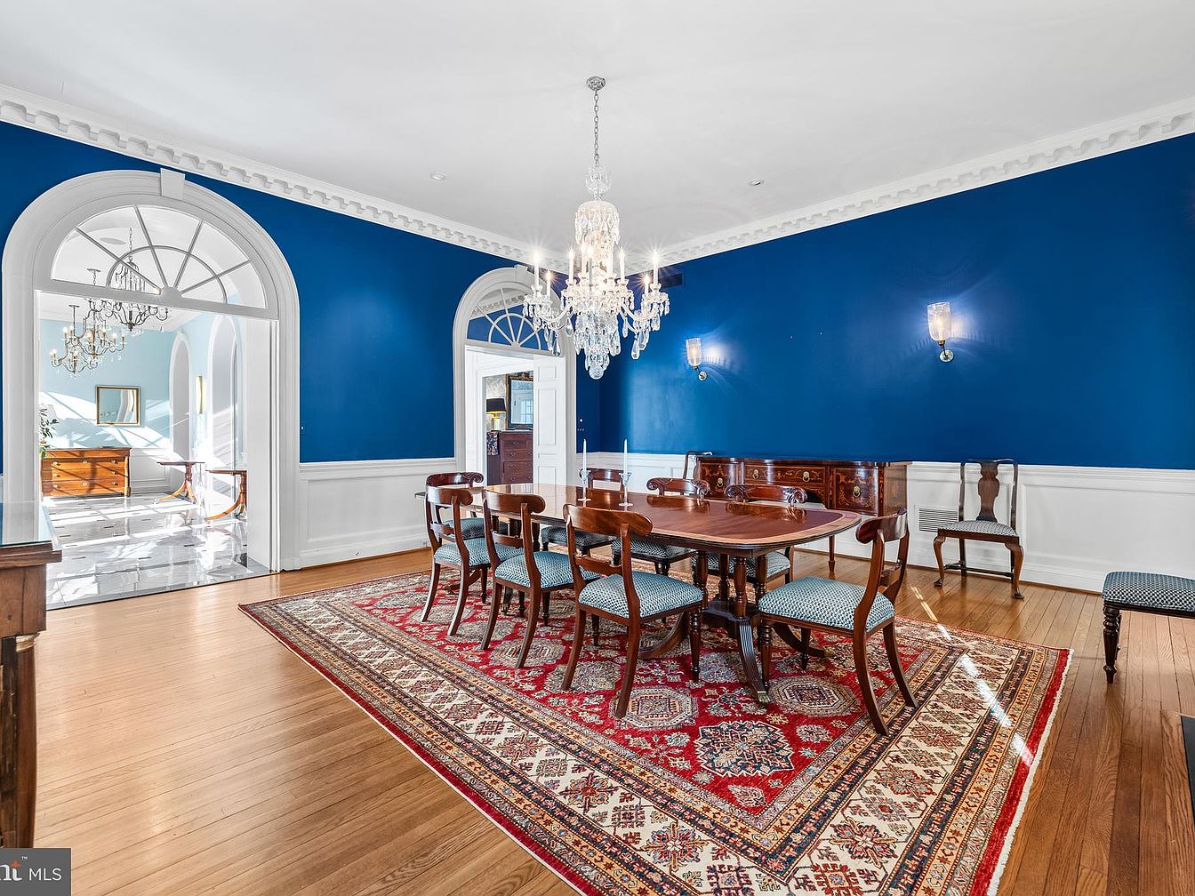 This formal dining room features rich royal blue walls above classic white wainscoting, highlighted by crown molding with ornate trim. A grand wooden dining table with eight matching chairs sits on a large, patterned red and cream area rug, adding warmth and elegance to the hardwood flooring. The room is adorned with crystal chandeliers and glass wall sconces, providing sparkling, sophisticated lighting. Two large arched doorways with divided glass panels lead to adjacent rooms, allowing ample natural light to flow in from the sunny, chandelier-lit hallway beyond, enhancing the luxurious and inviting atmosphere of this historic space.