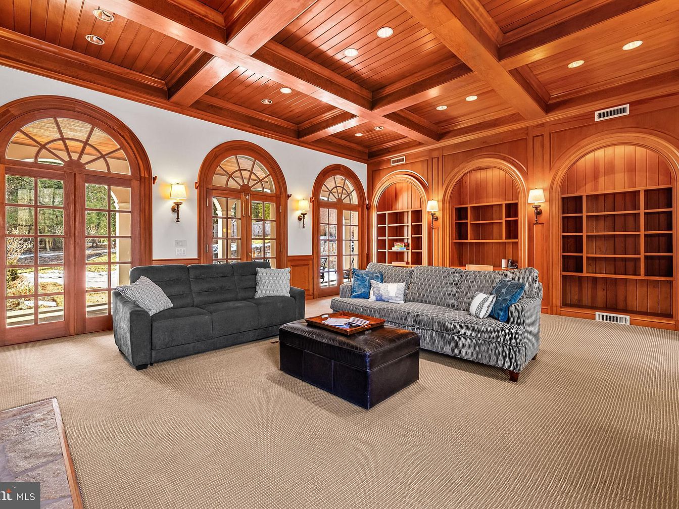 A spacious room featuring rich wood-paneled walls and coffered ceilings, finished in deep honey tones for a warm, classic ambiance. Large arched windows and French doors let in generous natural light, highlighting the symmetry of built-in bookcases lining one wall. Two sofas, one dark gray and one patterned in blue and gray, provide comfortable seating around a dark leather ottoman used as a coffee table. The tan carpet adds softness underfoot, while wall sconces mounted between the bookcases and beside the windows add soft, ambient lighting. Elegant and sophisticated, the space balances tradition with comfort.