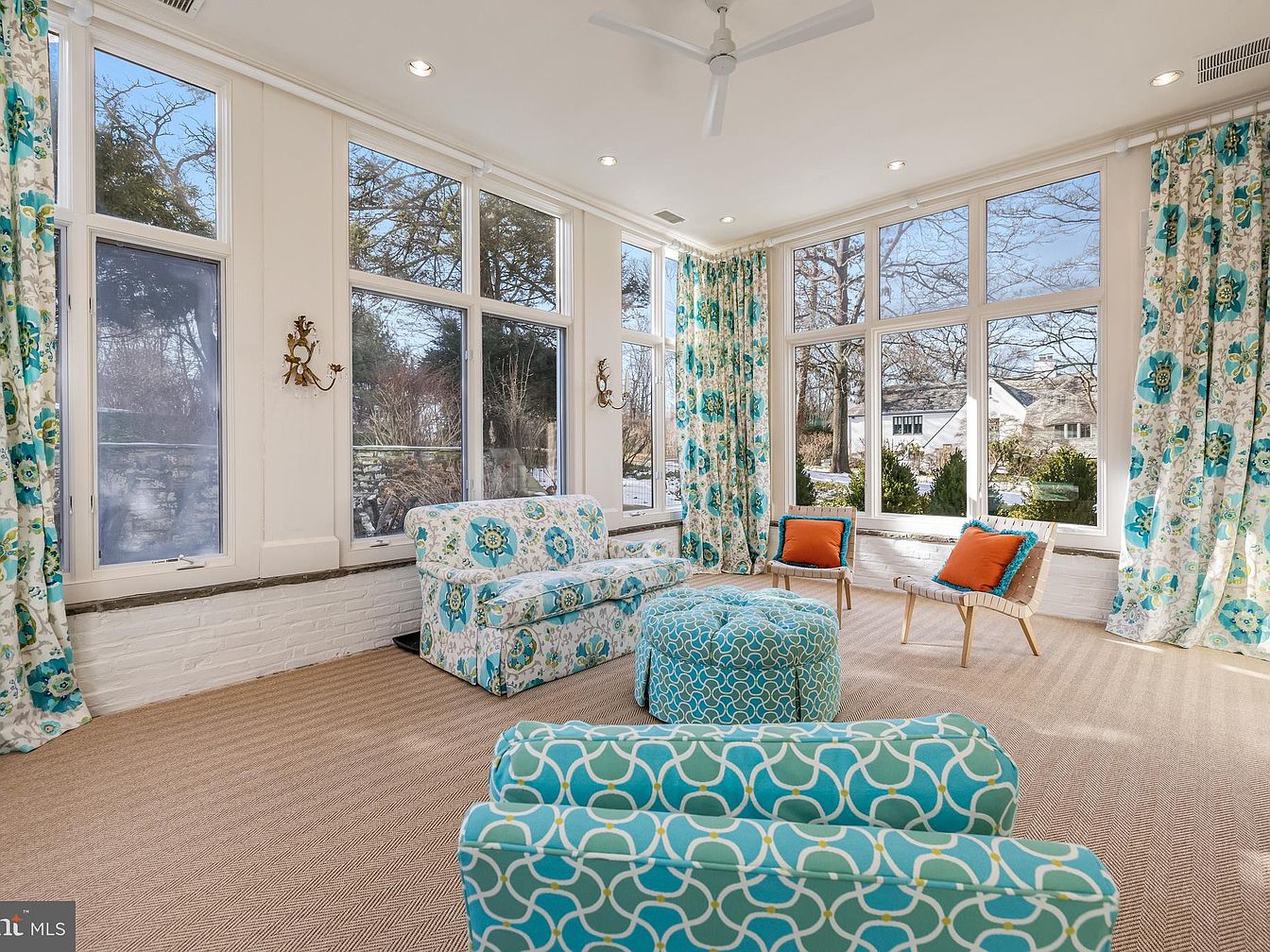 A bright and airy sunroom features a wall of large windows that let in abundant natural light, offering expansive views of the outdoor gardens and neighboring homes. The space is decorated in a cheerful turquoise and white color scheme, with patterned drapes and upholstered seating creating a lively but cohesive look. Furnishings include a cushioned sofa, playful patterned chair, and matching ottoman, accented by minimalist wooden chairs with orange pillows. The walls are painted a crisp cream, matching the white painted brick under the windowsills. Neutral woven carpeting grounds the room, while decorative gold sconces add a vintage touch.