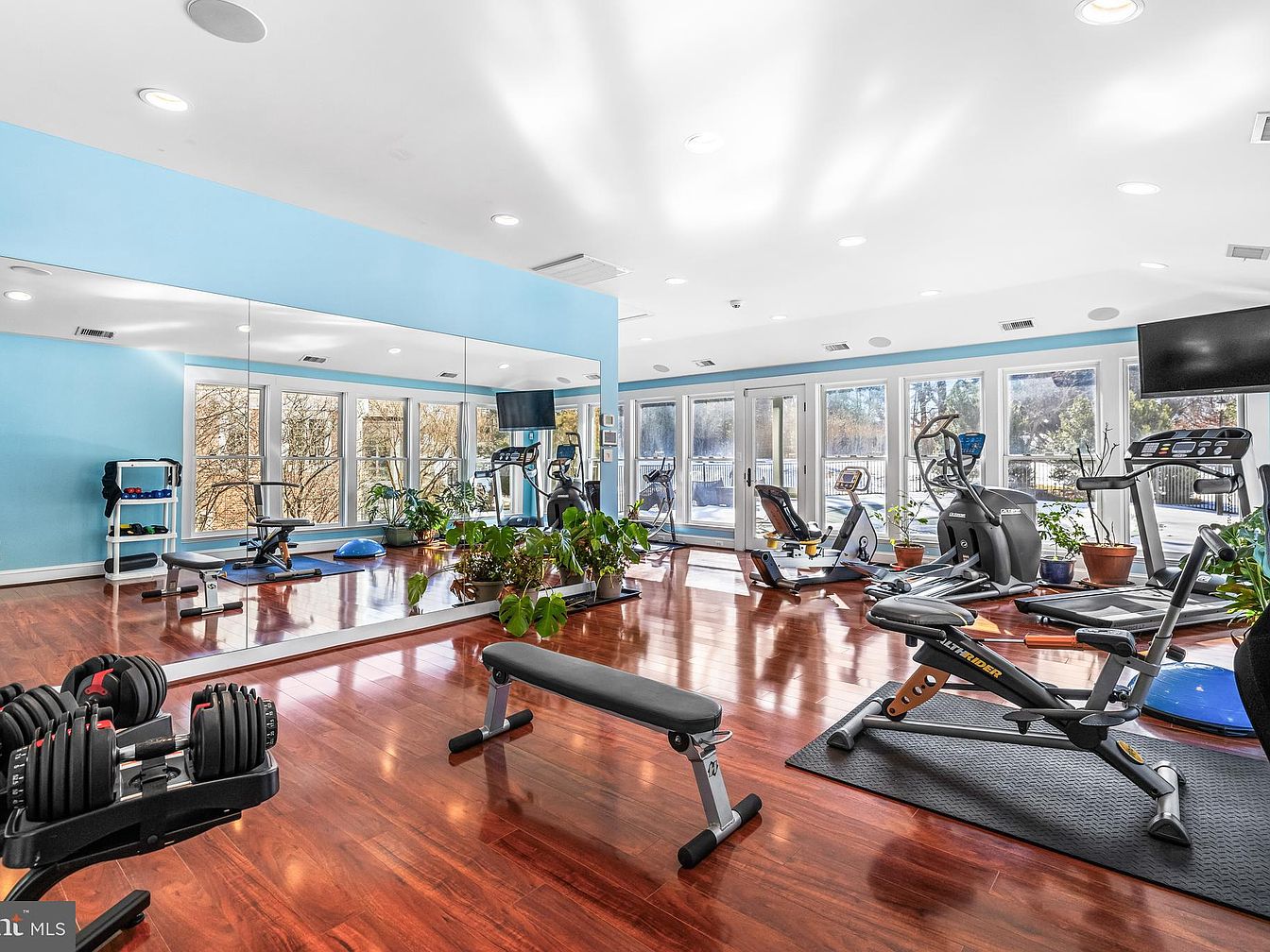 Spacious exercise room featuring glossy, reddish-brown hardwood floors and pale blue walls, creating a bright and airy feel. A full wall of windows lets in ample natural light and offers a panoramic view of the outdoors, while a wall-mounted mirror expands the sense of space. Modern fitness equipment, such as treadmills, stationary bikes, and adjustable benches, are spread neatly across the room. Free weights and fitness accessories are stored on a compact shelf. Several potted green plants add a touch of nature and freshness. Recessed lighting in a crisp white ceiling provides even illumination, complementing the clean, modern aesthetic.
