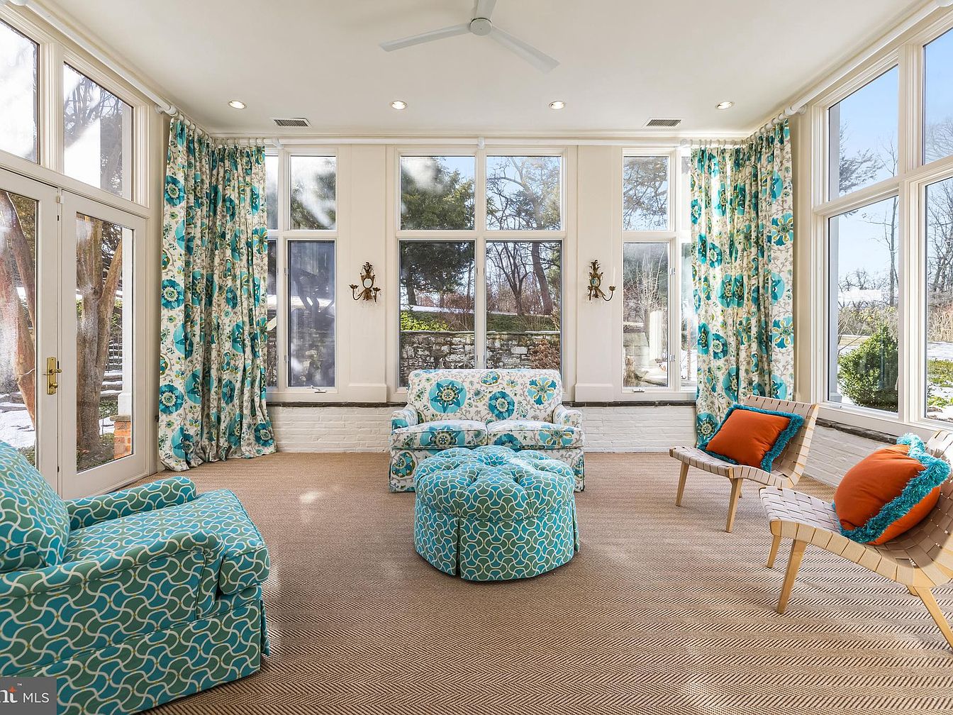 Bright and inviting sunroom abundant with natural light streaming through floor-to-ceiling windows on three sides. The color palette features vibrant turquoise, teal, and white, expressed through patterned curtains and upholstered armchairs with circular motifs. A matching ottoman sits centered on a light tan woven rug, adding a layer of texture. Two minimalist wooden chairs with light frames and orange accent pillows contrast the cool tones and bring warmth to the space. Cream-painted brick walls and French doors complement the fresh, airy atmosphere, while modern ceiling lights and a ceiling fan provide functionality and style. The views outside are lush and wintry.