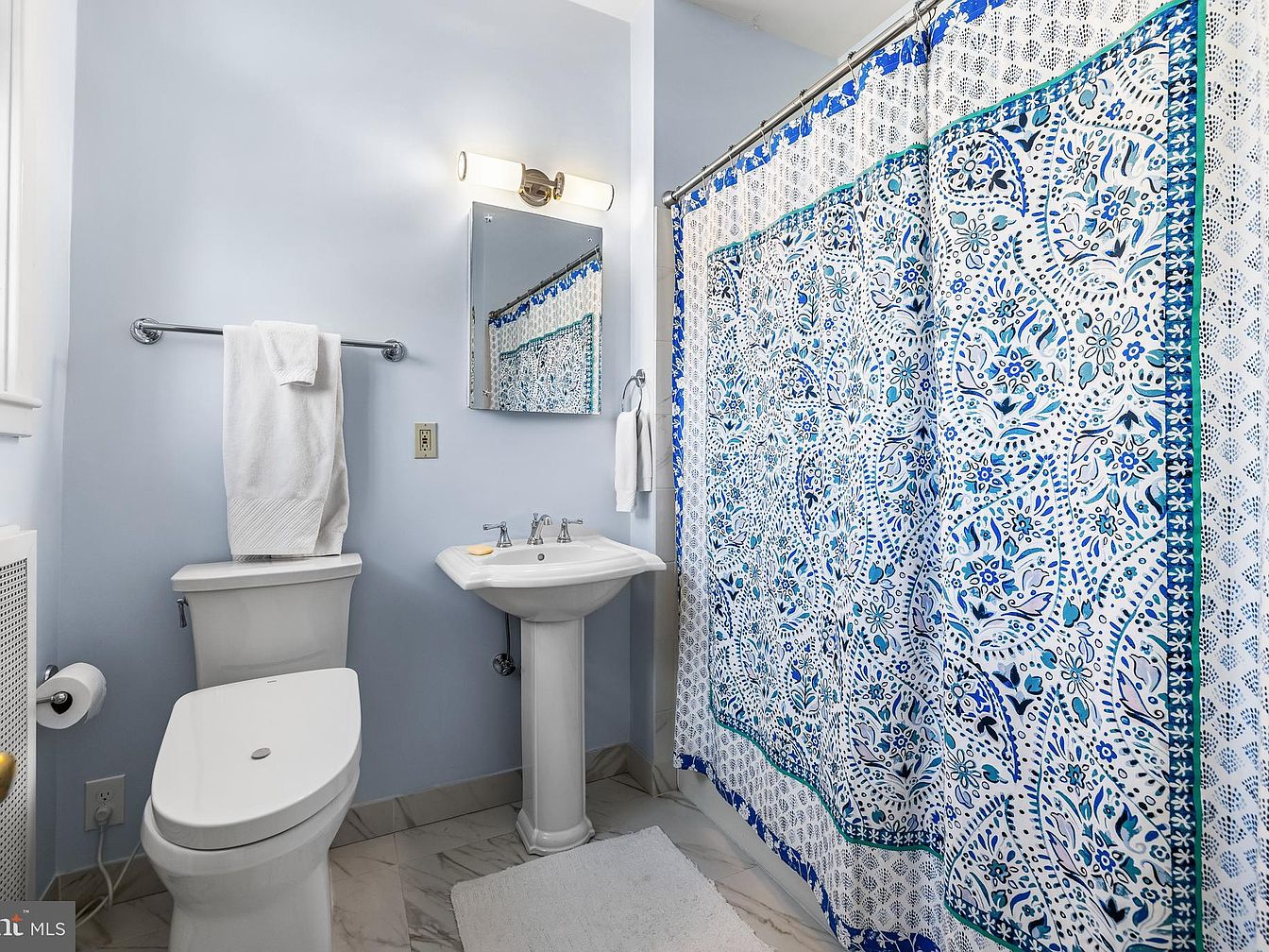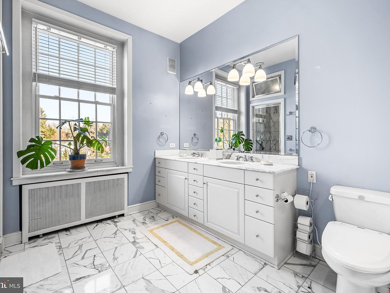 Spacious bathroom featuring a double-sink vanity with white cabinetry, marble countertops, and a large mirror running the length of the counter. Soft blue walls create a calming atmosphere, complemented by gleaming white and gray marble floor tiles. The room is brightened by natural light streaming through a large, multi-pane window above a radiator cover, with a potted monstera plant adding a touch of greenery. A modern white toilet sits to the side, and wall-mounted fixtures include towel rings and elegant light sconces above the mirror, enhancing the fresh, serene aesthetic.