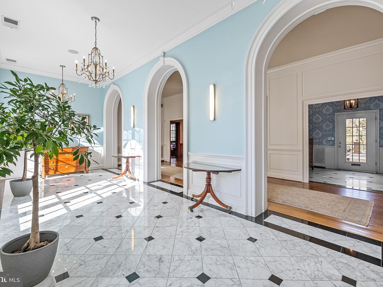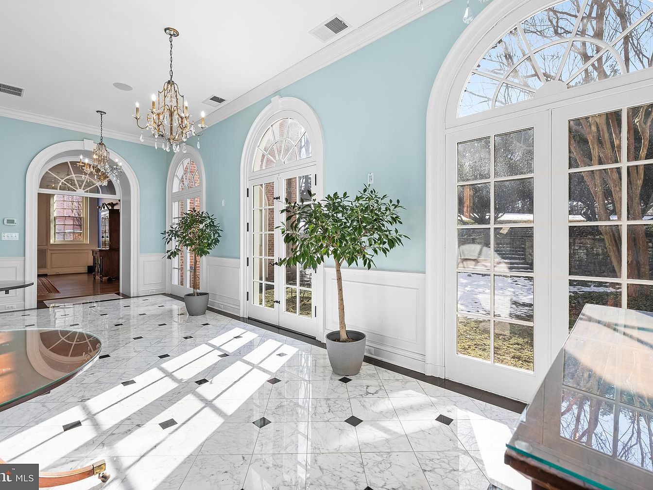 Bright and elegant, this sunroom features tall arched glass doors and windows that allow abundant natural light to flood in, highlighting the glossy white marble floors with subtle gray veining and black diamond accents. The walls are painted a soft powder blue above classic white wainscoting, creating a serene and refreshing atmosphere. Two chandeliers with crystal detailing add a touch of formality and sparkle from the ceiling. Potted green plants sit near the windows, providing organic color and softness. The room opens through large archways to adjacent spaces, giving a sense of flow and grandeur throughout the home.