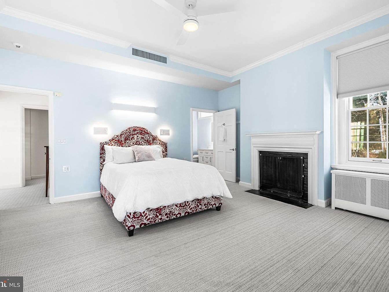 A spacious bedroom features soft blue walls and crisp white trim for an airy, tranquil feel. The bed stands out with a patterned red and white upholstered headboard and matching base, topped with white bedding and plush accent pillows. To the right, a classic black fireplace with an ornate white mantel adds historic charm. A large window fills the room with natural light, while modern wall sconces and a ceiling fan provide both style and comfort. The carpet is light gray with subtle texture, and a doorway leads to an adjoining bathroom with white cabinetry, reinforcing the serene, cohesive palette.