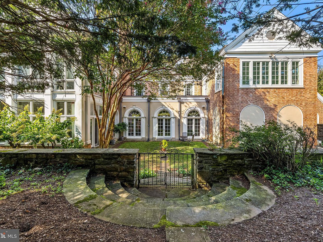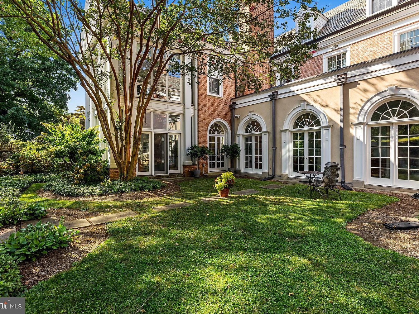 A lush green garden courtyard rests in the heart of this historic home, enclosed on two sides by stately brick and stucco walls. Tall, arched French doors and windows framed in white allow natural light to pour into adjacent rooms, while a multi-story bay of glass amplifies the elegance. A mature tree anchors one border of the garden, surrounded by deep landscape beds filled with shrubs and leafy plants. Paved stone walkways crisscross the lawn, leading to a small wrought iron table and chair set, perfect for quiet outdoor moments. The atmosphere is tranquil and inviting.