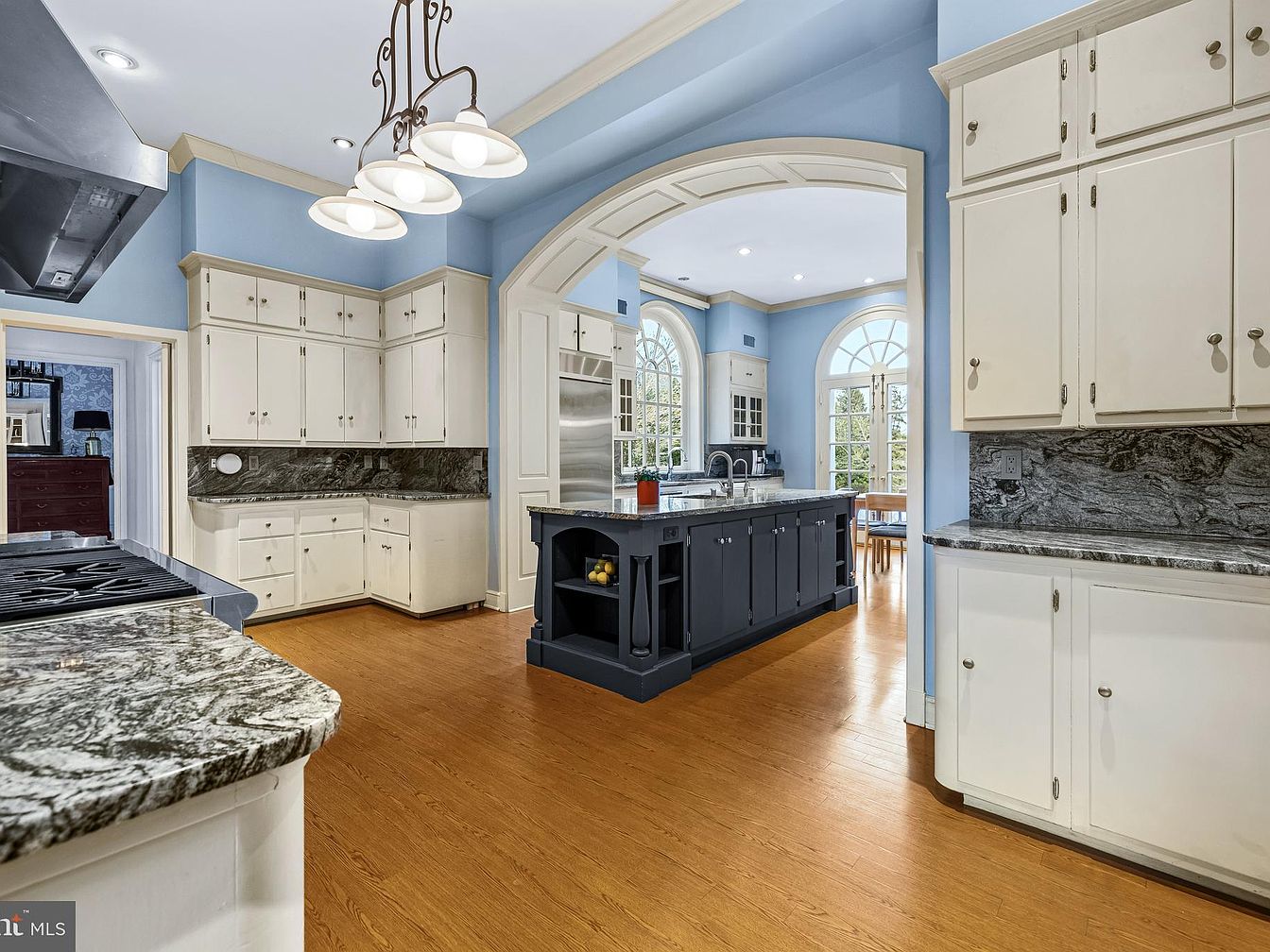 Bright and inviting kitchen featuring a large central island painted in a deep slate blue surrounded by off-white cabinetry with simple hardware. Natural light pours in from tall arched windows in the adjoining breakfast area, enhancing the airy feel. The countertops and backsplash are a striking marbled gray, complementing the sky blue walls and cream-colored trim. Warm-toned wood floors add a touch of coziness. Overhead, a trio of globe pendant lights hangs above the workspace. The arched doorway elegantly frames the transition between kitchen zones, blending classical and contemporary aesthetics.